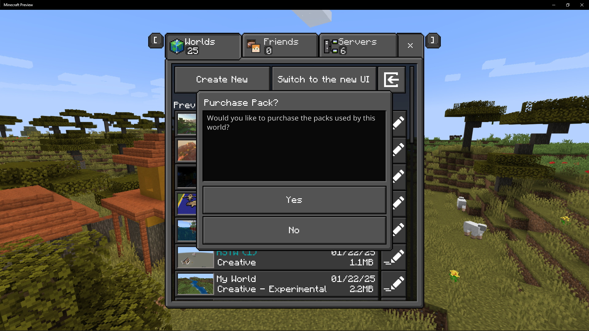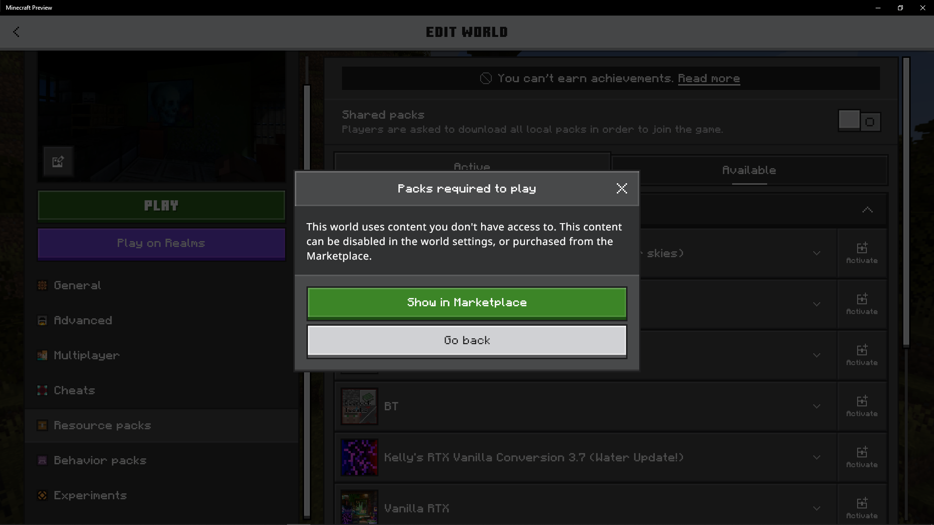 even after removing or adding owned pack the same message shows up. Clicking yes attempts to bring me to the marketplace but is says its down, I am able to open the marketplace normally. This affects some worlds including my main test world but not all.