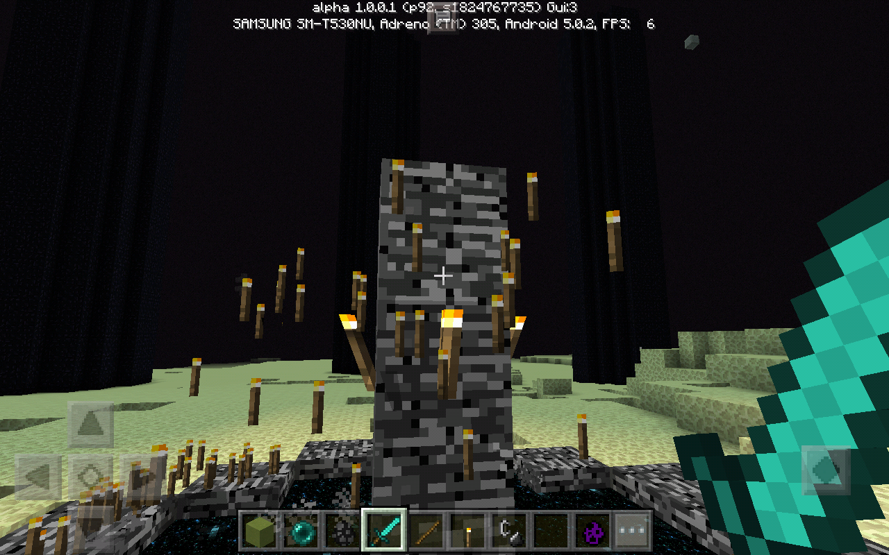 When I updated to 1.0.0.1, I opened my creative world and went to the end and was met with massive lag. Near the end portal (having killed the dragon multiple times) was a fountain of torches spewing out of the torch blocks with the bedrock of the portal flickering. For some reason the bedrock was breaking itself dropping the torches then regenerating.