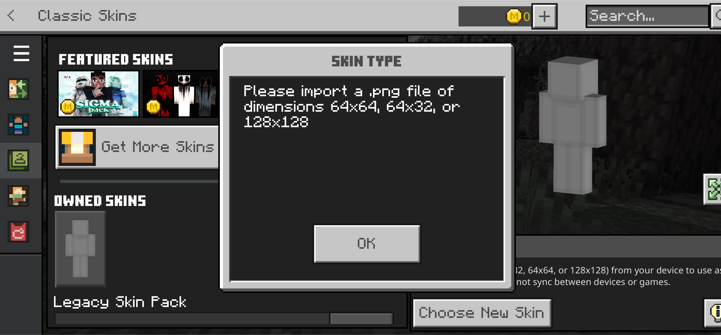 I can't upload a skin from my phone because it says the image needs to be of the correct size and a .png file. I made sure the skin was the correct size and file type, but it still have me the warning. I even resized it from 128x128 to 64x64 and that still didn’t work.