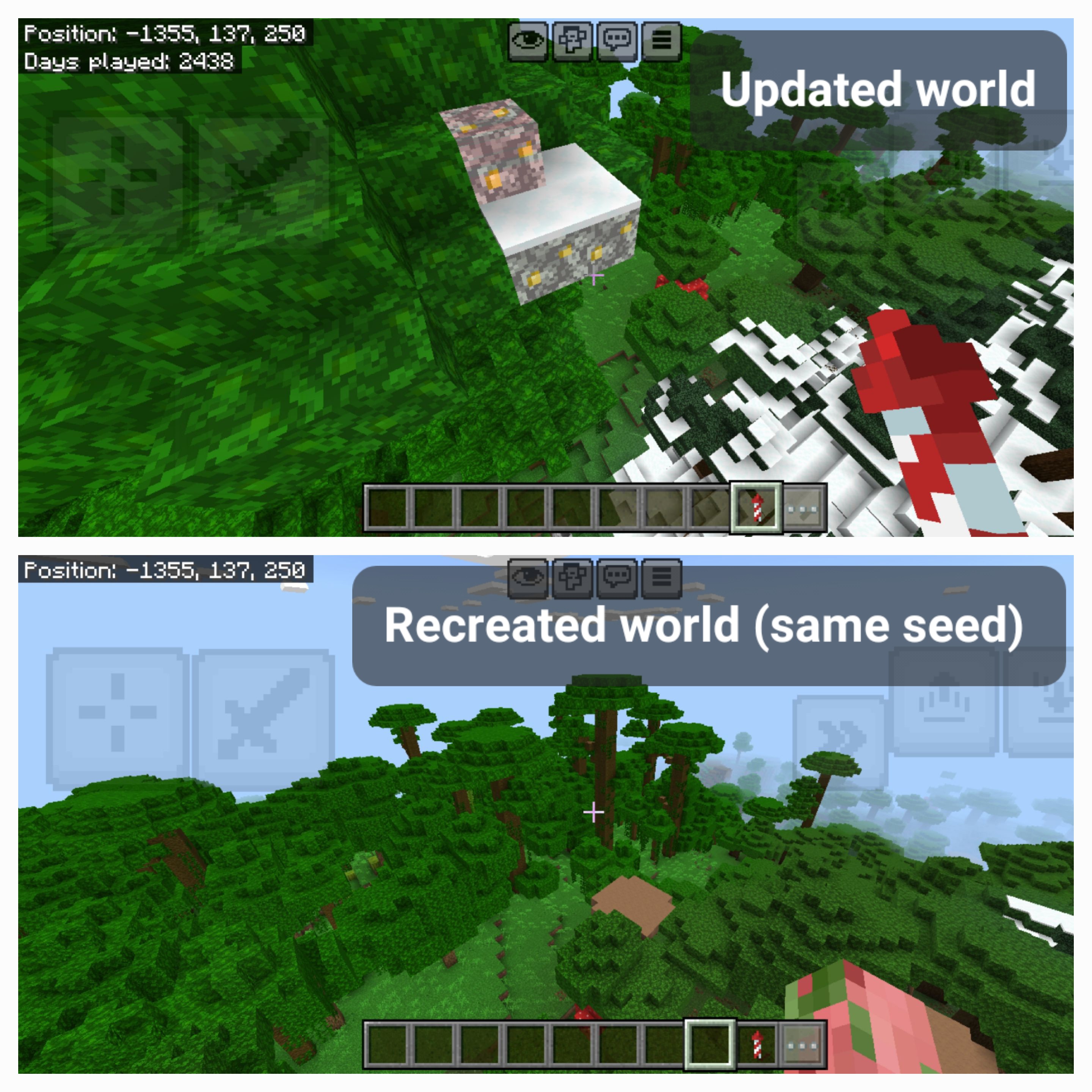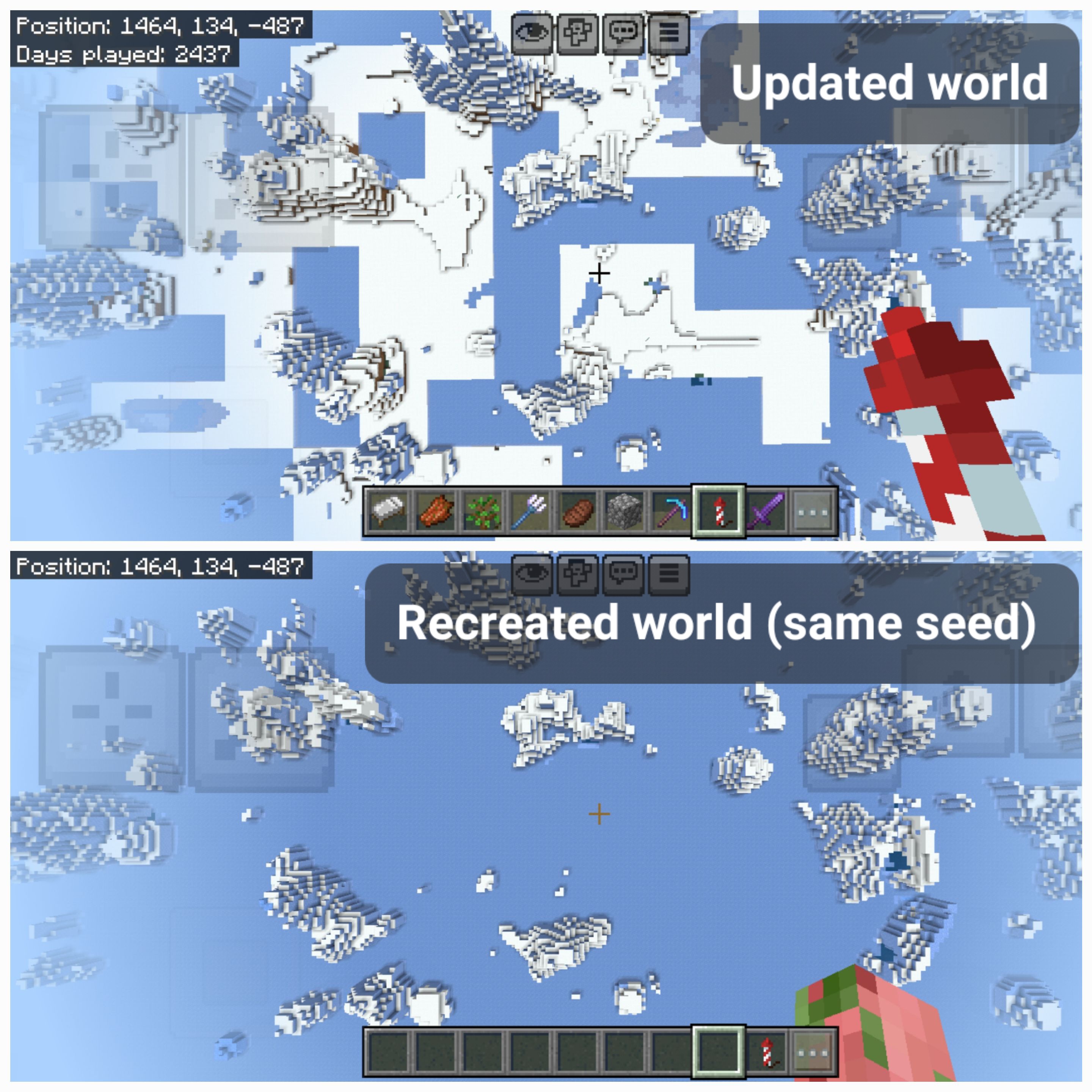 When updating to the new 1.21.70, I noticed that some specific new chunks are broken. Chunks of ocean simply missing, water floating on the edge of chunks, ice biome completely mixed with other ice biomes, etc. It seems to happen mostly where there is water.