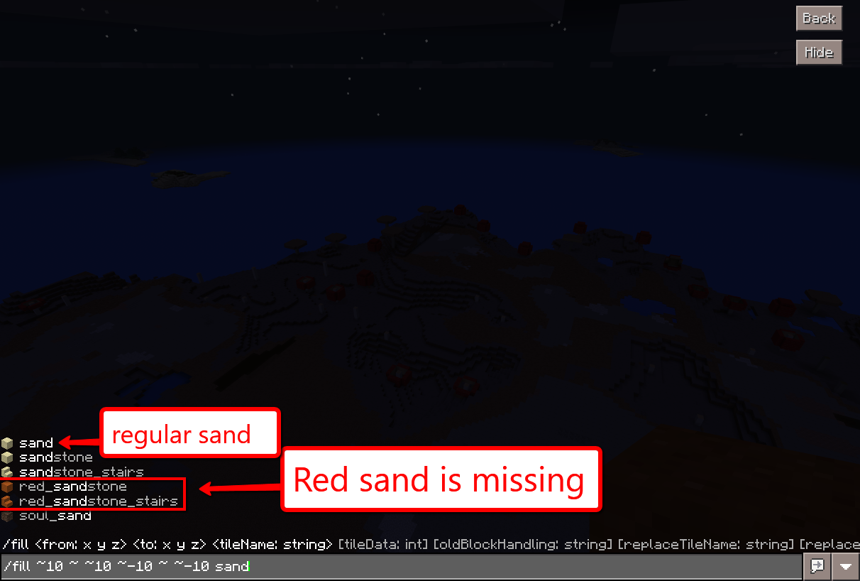 When you use the fill command, the block item for red sand is missing from the suggestion list. See photo attached. You will notice that the regular sand variant is in the list, but the red sand variant is missing.