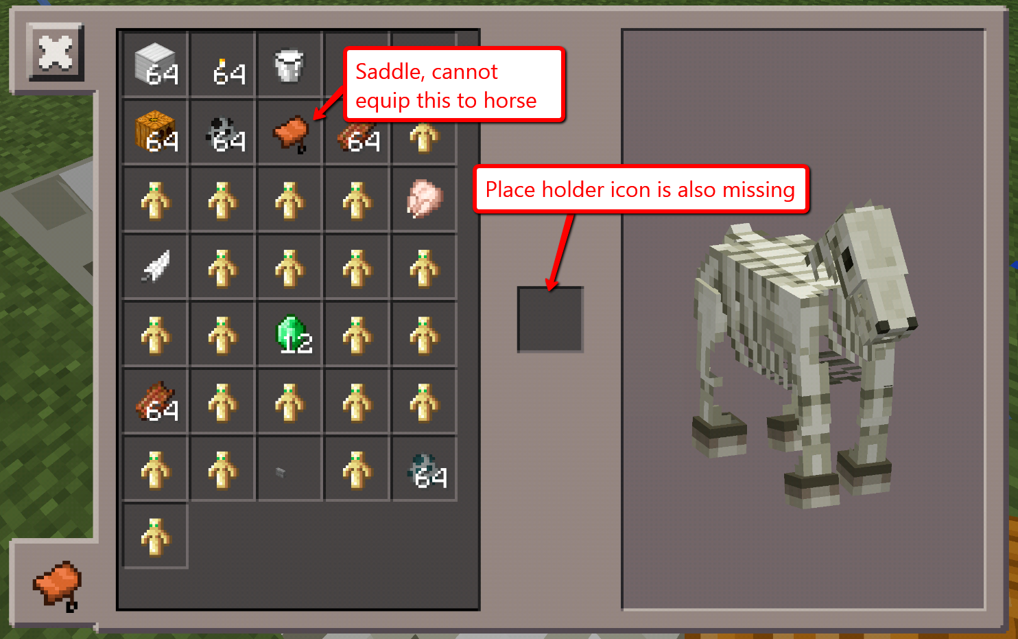 Skeleton horses can not be saddled and horses when fed wheat do not show hearts. The ride button appears, and the player can mount the horse, but the saddle can not be applied. Have been waiting for this bug to be fixed since the polar bear update, but it hasn't been fixed. Decided to post bc horses are the most important thing to me in the game.