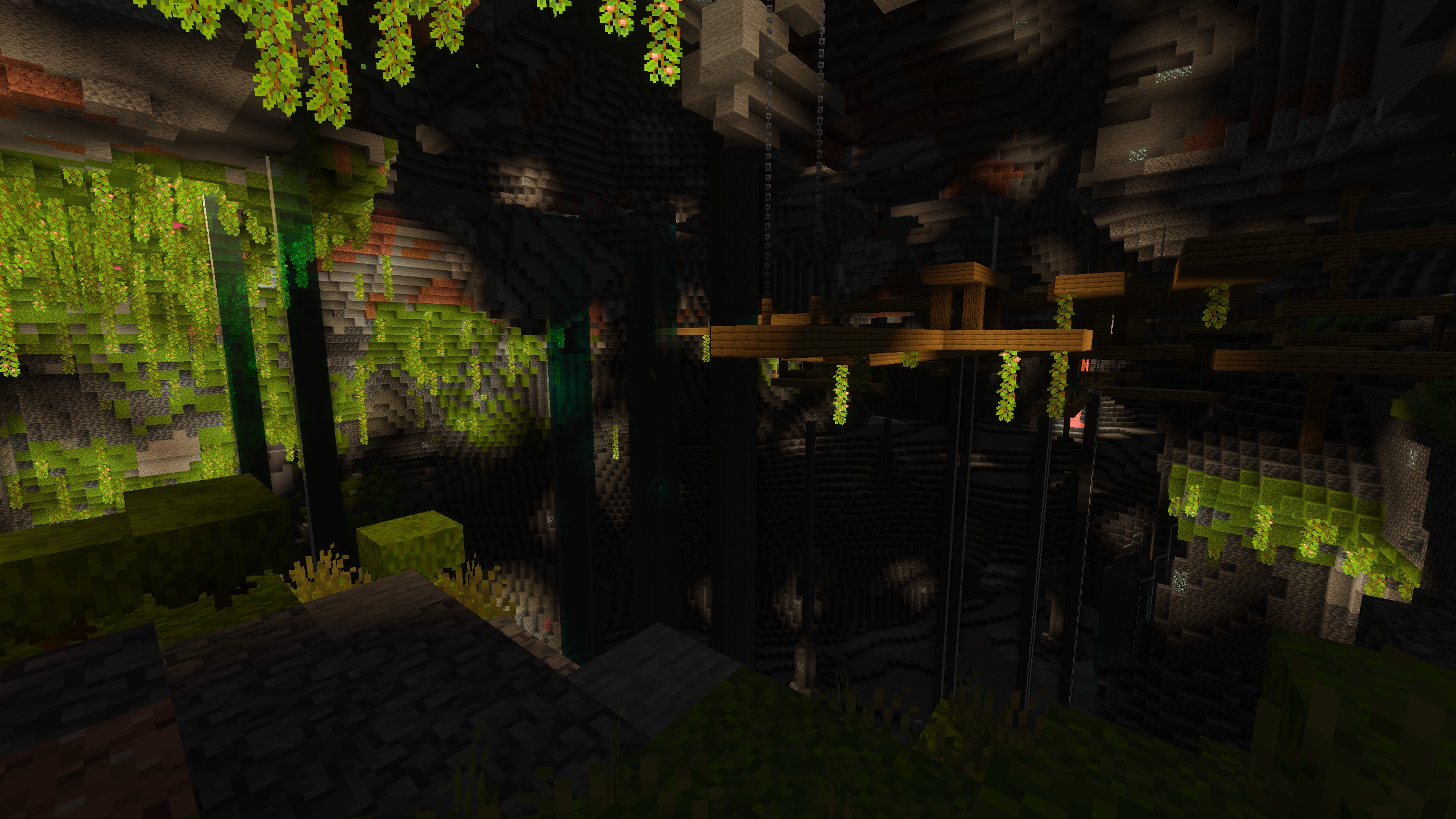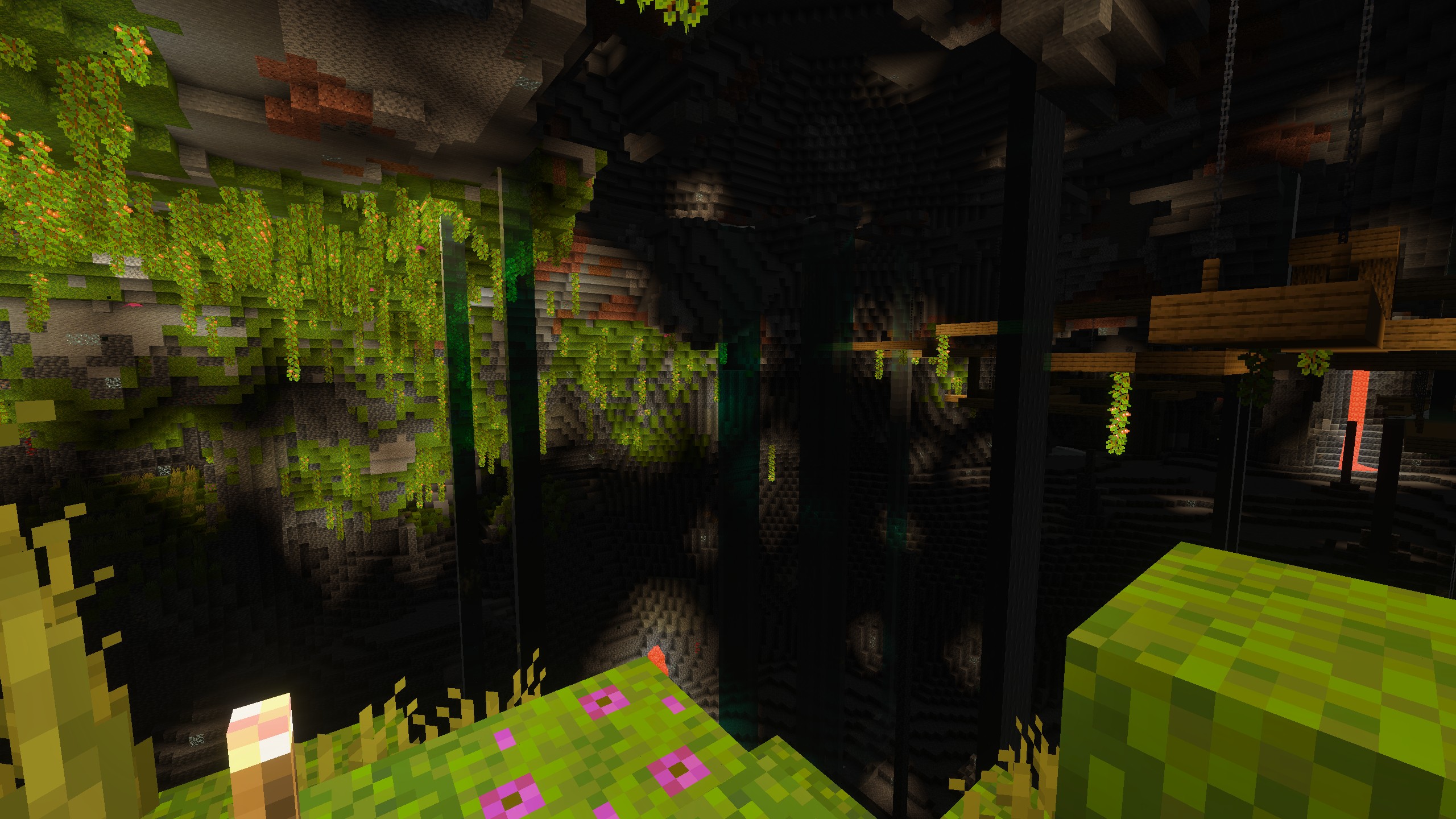 Enabling Volumetric fog causes blooming to appear around water in dark areas. The blooming is only visible when the player stands next to a light source (torch, etc.).
