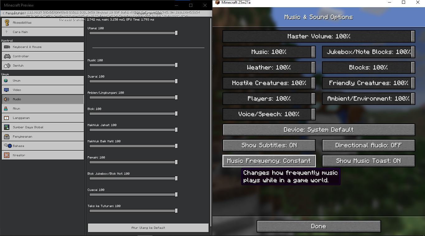On Snapshot 25w20a, a new options "Music Frequency" was added to Music & Sounds settings, this options changes how frequently the music will plays while inside a worlds (default, frequent, or constant), this options is missing on Bedrock Edition.