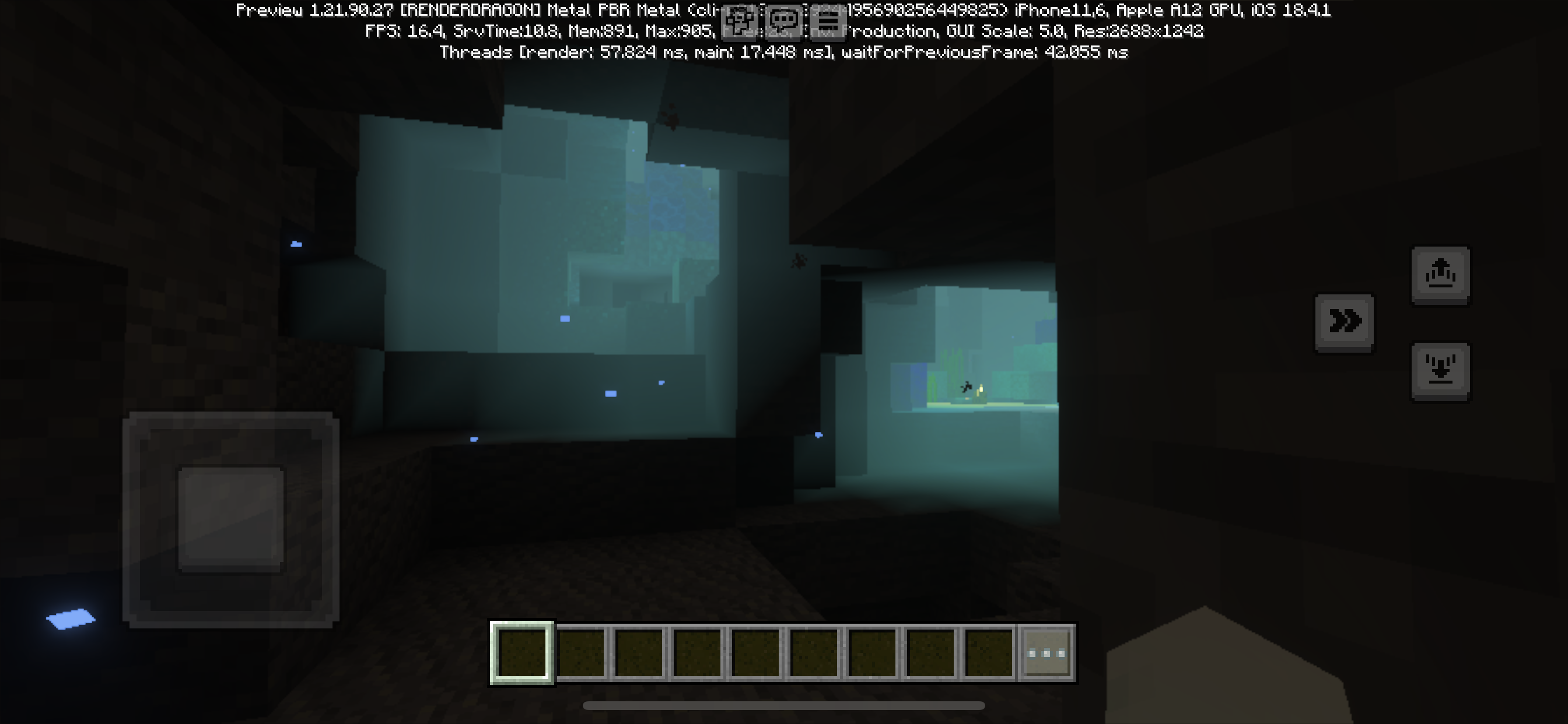 In the non-vibrant-visuals rendering, when the player is underwater the camera illuminates somewhat like a night vision effect. Although this “water vision” is arguably too strong (MCPE-57701), it allows players to see so that they can navigate and know that they are in water. However, in vibrant visuals this “water vision” is not present at all. As a result, in areas where there is no block light or sunlight the water fog darkens to near total blackness. It is difficult to see anything and feels more like floating in outer space than being in water.