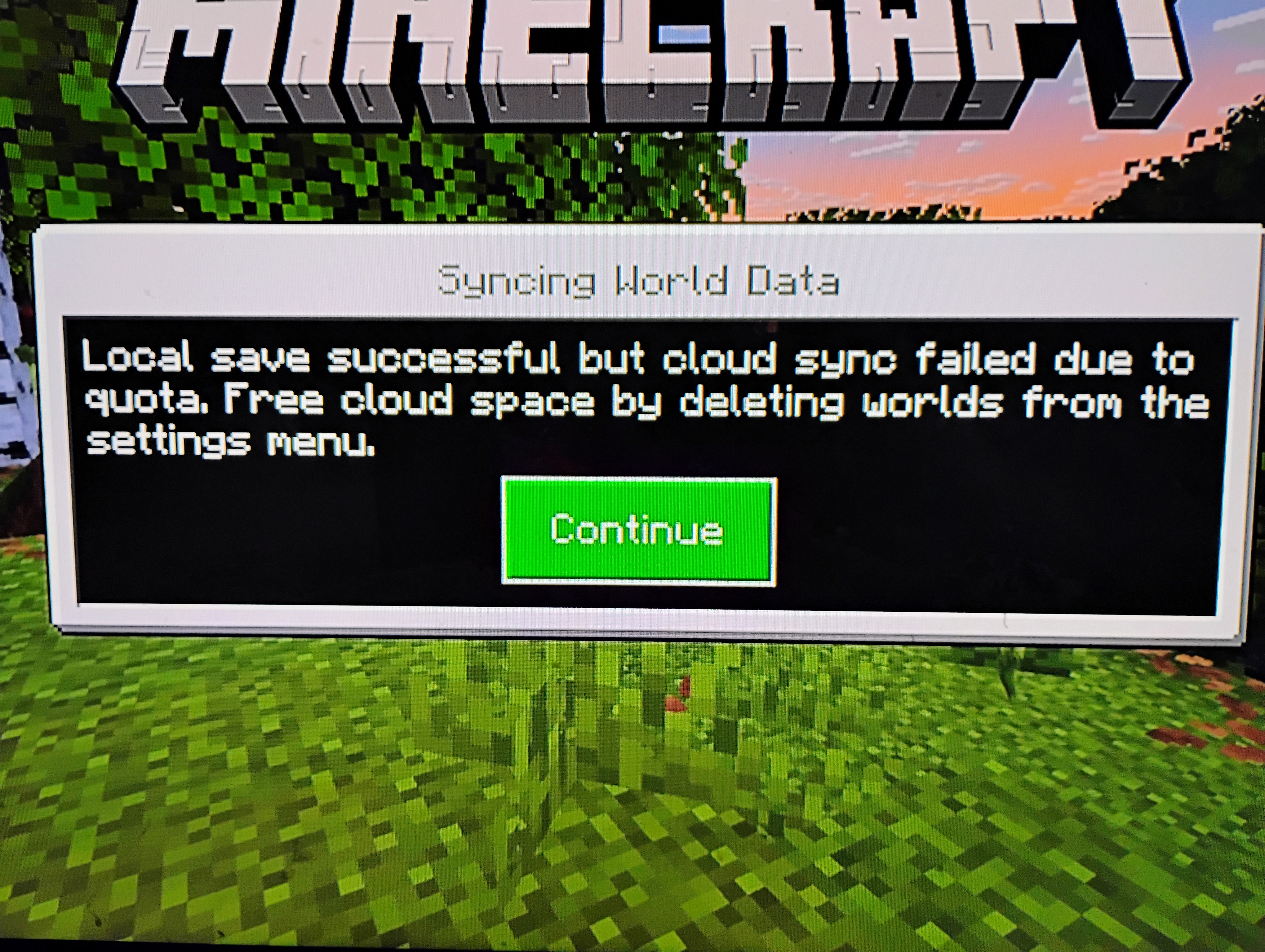 When I save my game, I get the message; “Local save successful but cloud sync failed due to quota. Free cloud space by deleting worlds from the setting menu”. This is not possible as the amount of storage for worlds doesn’t even come up to 2GB. Reading descriptions from other players states that deleting all your other worlds does not resolve the issue, as well as using realm to upload, then re-download does not fix the issue. Please fix this issue, I don’t even want to play Minecraft now out of fear that the data would get deleted or corrupted on the local console.