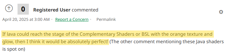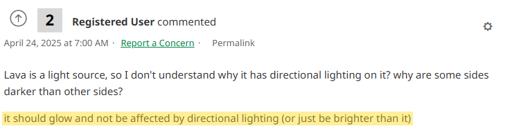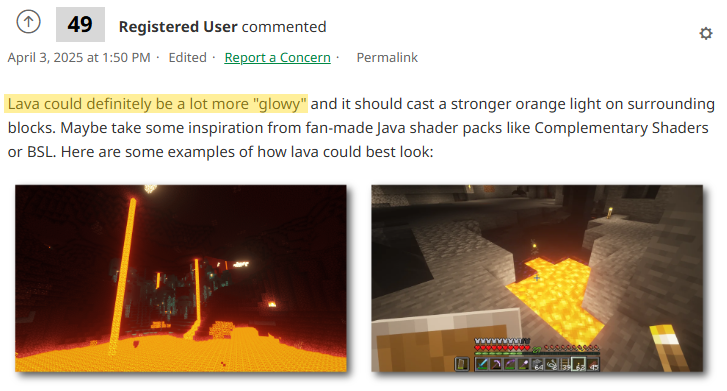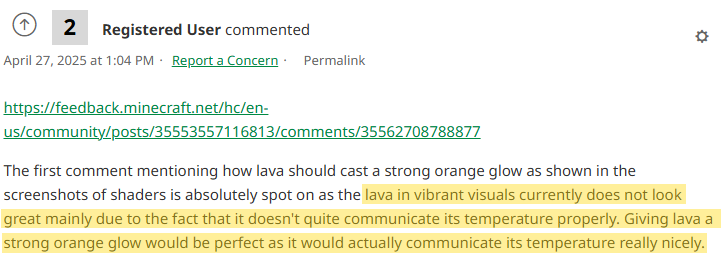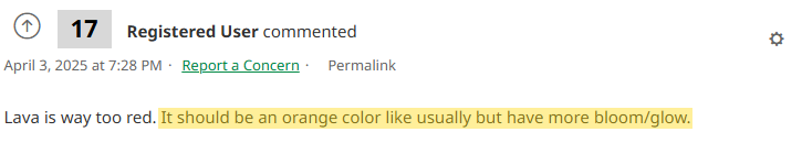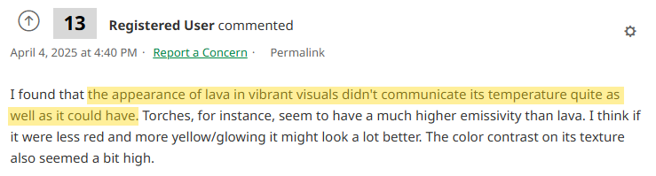 What's interesting is that this issue has been repeatedly mentioned (April 3, 2025 at 1:50 PM, April 3, 2025 at 7:28 PM, April 4, 2025 at 4:40 PM, April 27, 2025 at 1:04 PM, April 24, 2025 at 7:00 AM, April 20, 2025 at 3:00 AM) in the feedback post regarding how lava looks in Vibrant Visuals. In fact, the first created and most upvoted comment mentions this but no effort has been made to change the way lava looks in any of the previews.