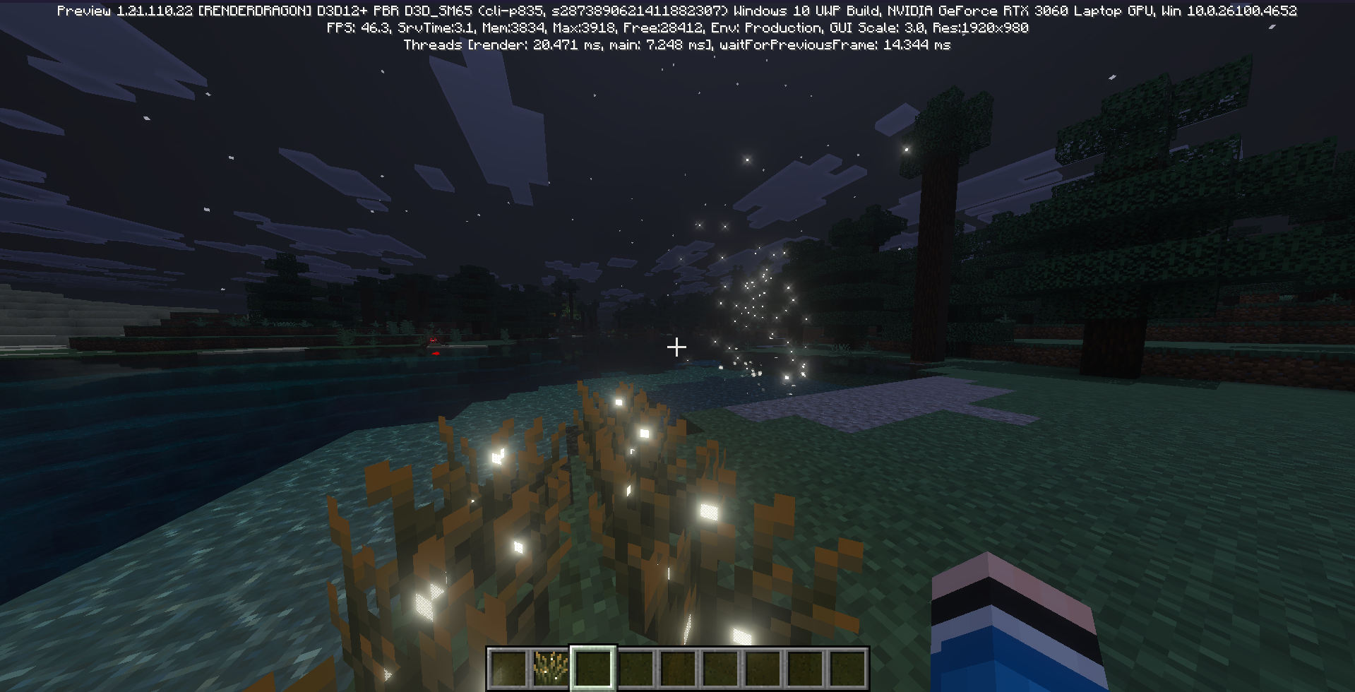 In the Preview version 1.21.110.22 of Minecraft Bedrock Edition, I noticed that fireflies can be seen floating in midair at a significant distance from the Firefly Bush blocks that are supposed to generate them. Instead of remaining close to the bush, the particle effect appears to be rendered several blocks away in open space, which breaks immersion and does not match expected behavior.