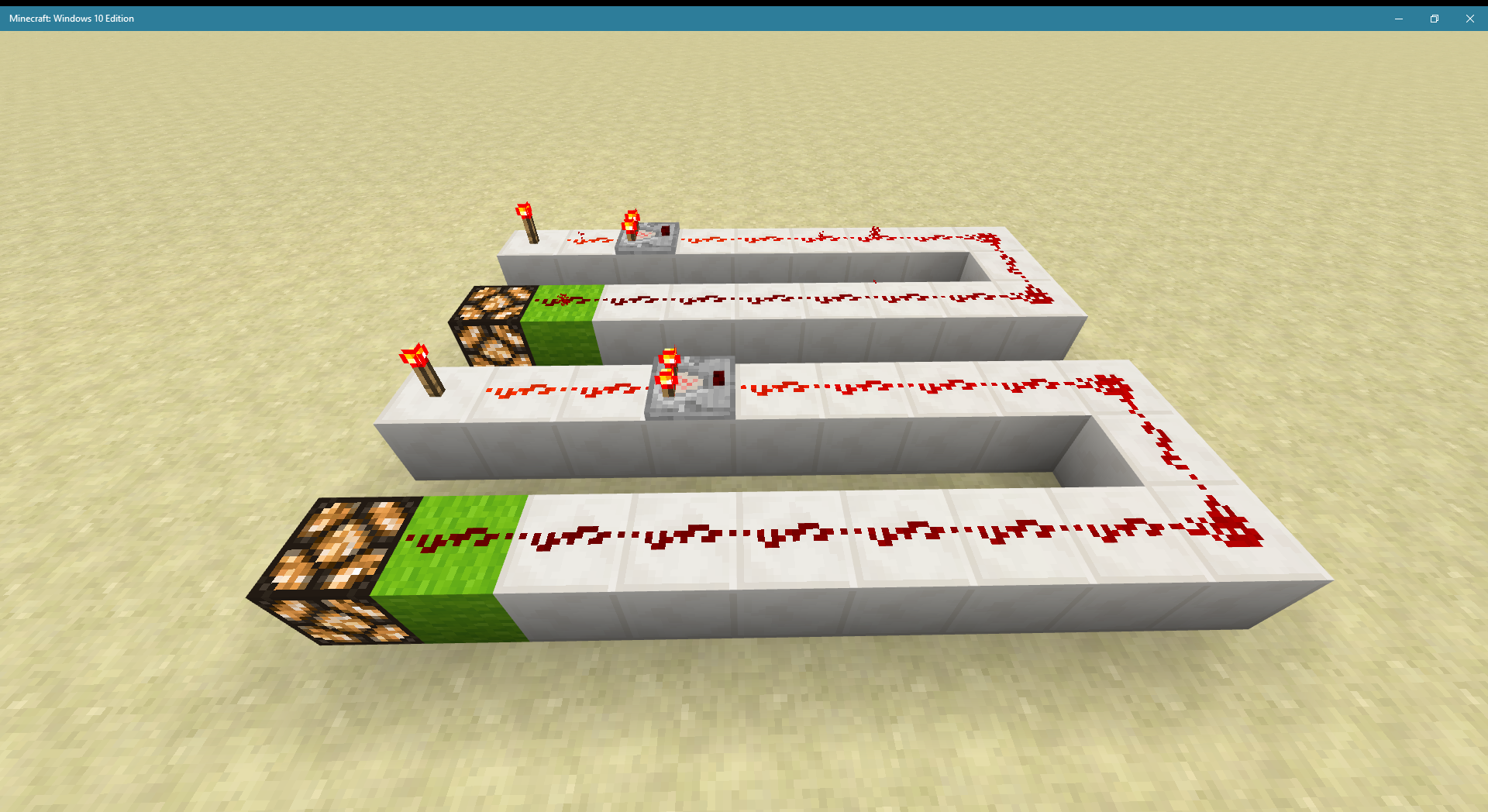 The "With redstone dust" image shows the same circuits with a redstone dust added to the top of the lamps. In the top circuit, where the comparator is powered at level 15, the lamp continues to be lit, which is correct. But in the bottom circuit, where the comparator is powered at level 14, the lamp is dark, even though it is being powered by the green block.
