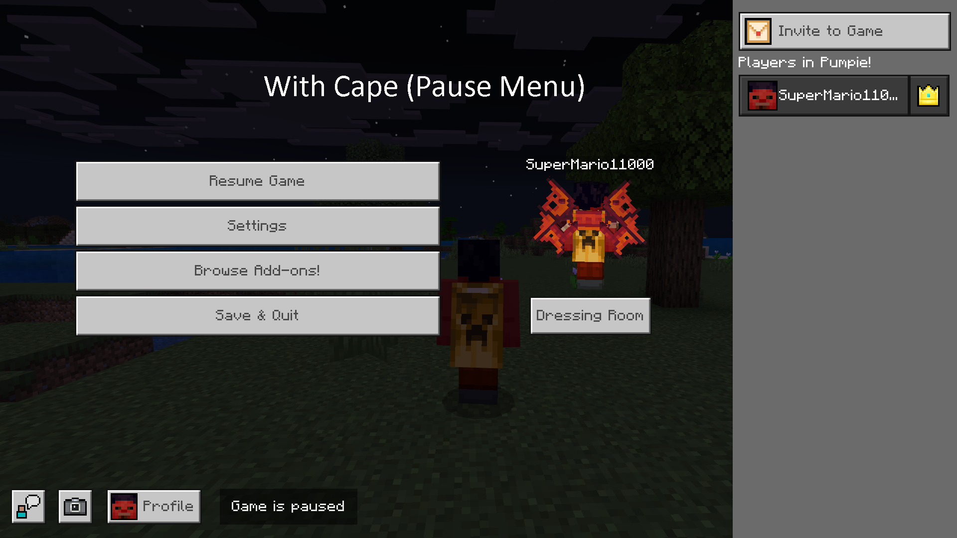 Actual result: The in-game skin (inventory cam and top left cam as well) is missing most of the upper cosmetics excluding the cape, while still showing it correctly in the pause menu.