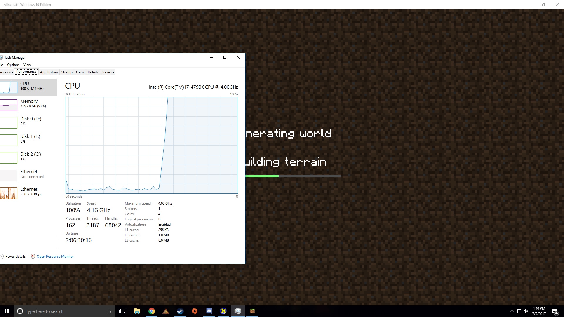 After playing for a few days on the map, I began to experience extremely sudden FPS loss, which I worried was due to overheating. My CPU will suddenly jump from 48C to 65C when Minecraft leaps from around 20-35% of my CPU to 100% of my CPU usage, causing all sorts of problems. My Xbox 360 controller has buttons that suddenly stop working, the world chunks don't always load in, and when placing objects in the world, they glitch/dupe/disappear.