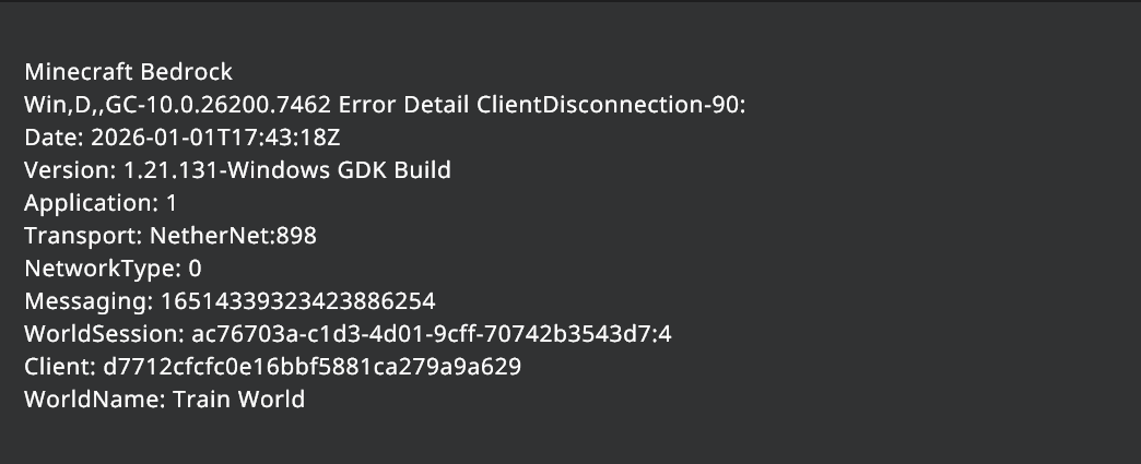 When using /tickingarea list with 10 ticking areas active, the world closes with a “Block” error, with details listed below. Other commands appear to be effective. The resulting world closure is instant.
