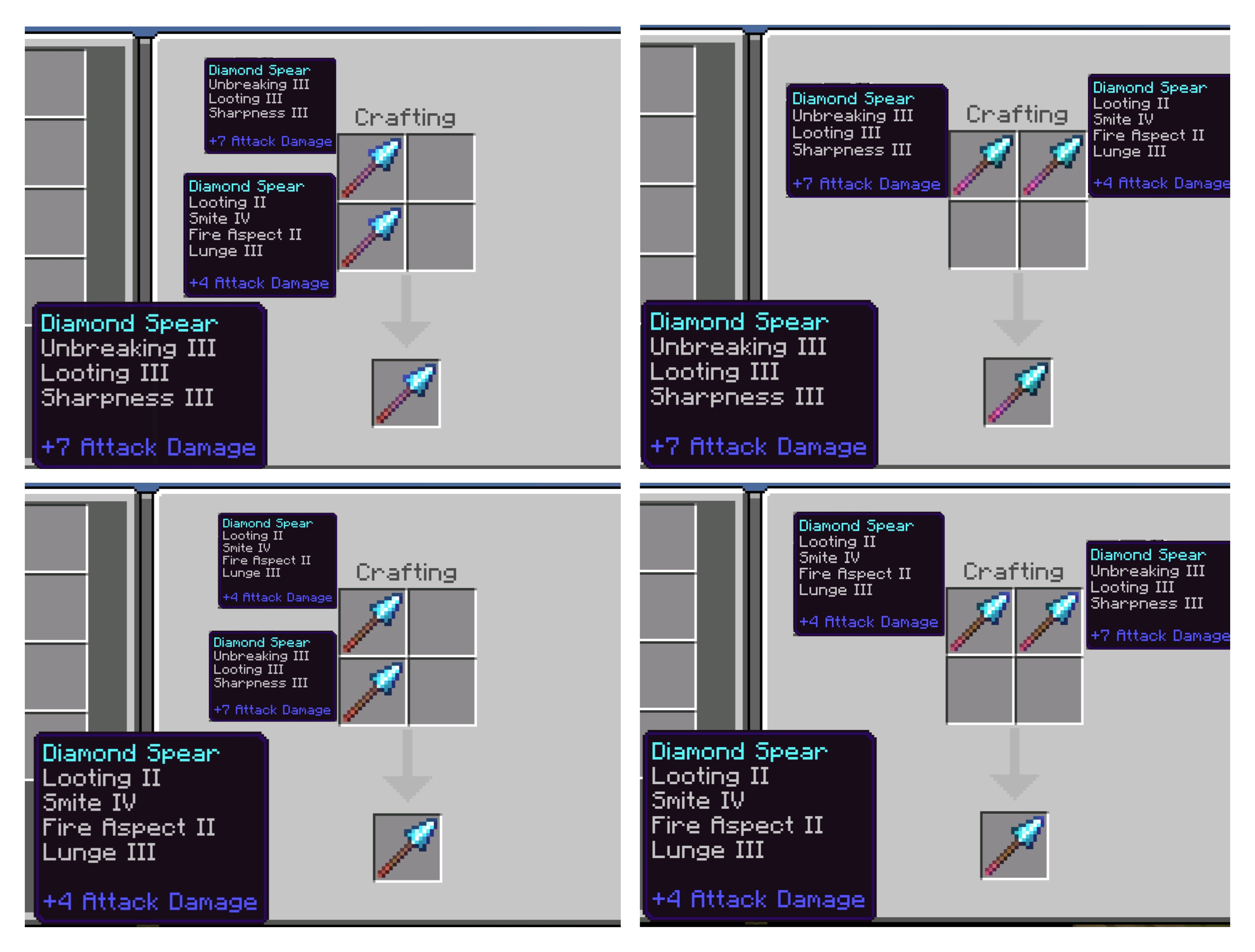 It's widely known that two equipments with same sort and material can be crafted into one single equipment, and both of their enchantments get lost(except for curses). However, after "Mounts Of Mayhem"update, spear becomes to an exception. When you put two enchanted spear(the picture below takes diamond ones as example)in the crafting areas, you're expected to get an enchanted spear.