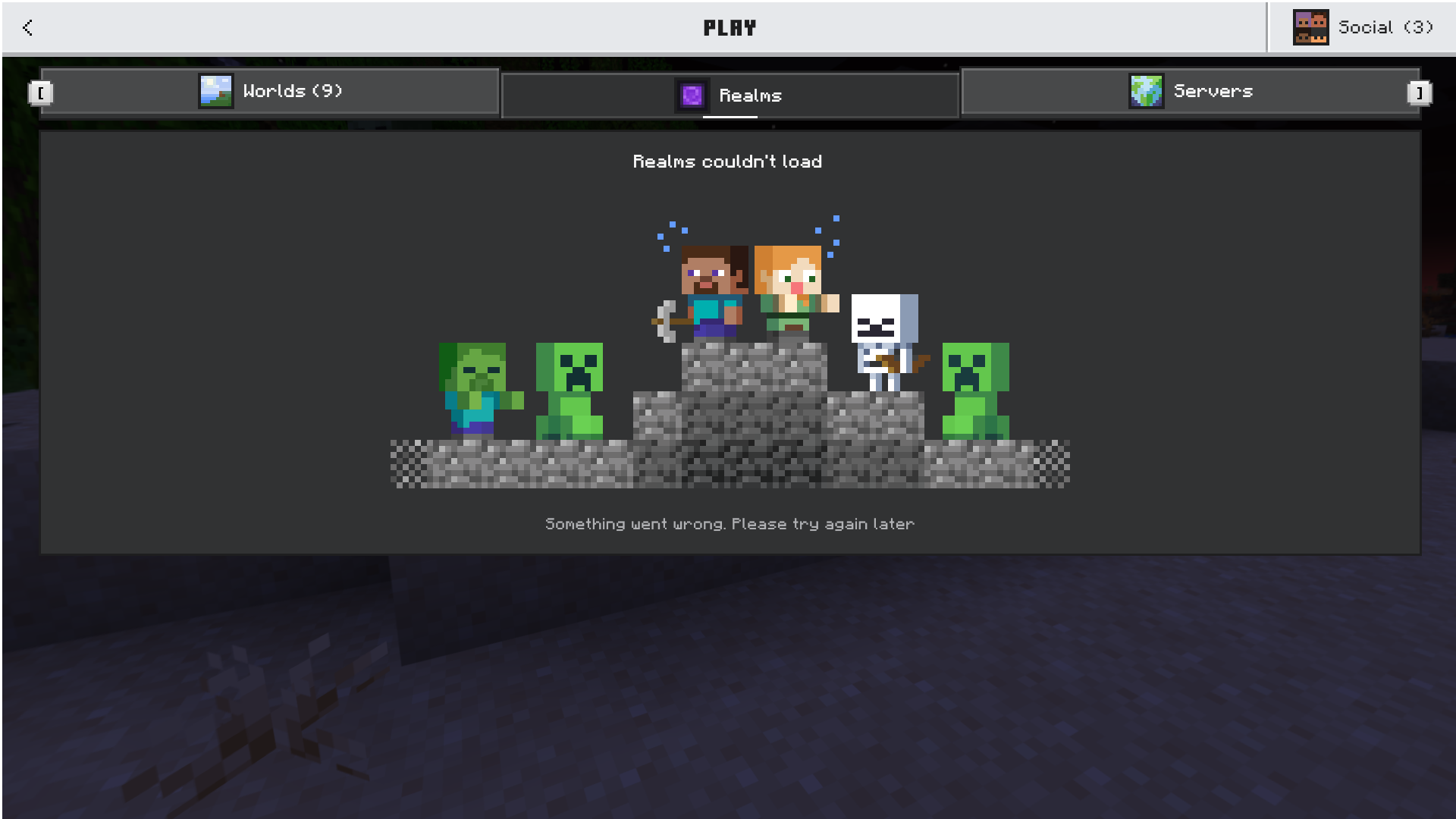 The Realms page on Bedrock edition has constantly been showing the “Realms couldn’t load” screen all of a sudden. The page doesn’t even attempt to load and I haven’t seen outages or others saying theirs is the same.