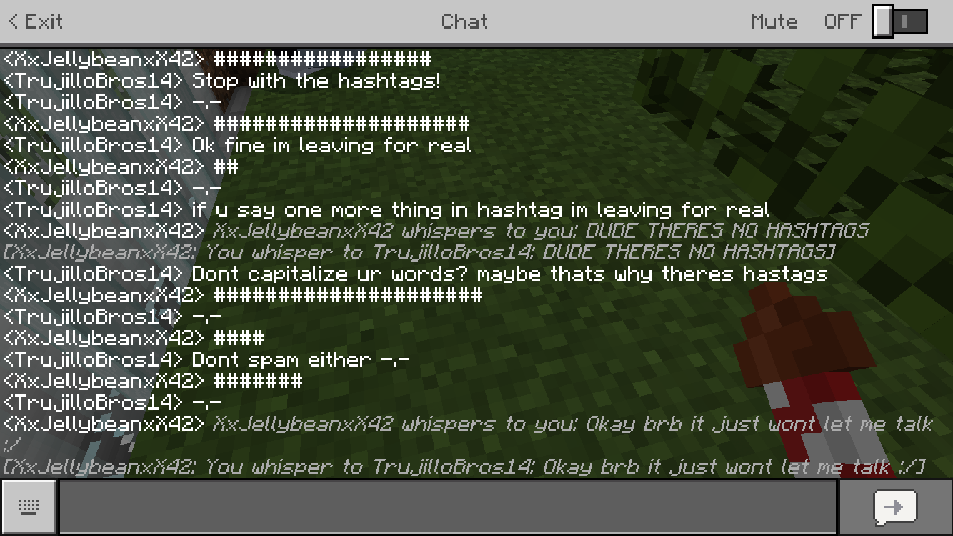 There’s this very annoying thing after the 1.2 update was released where no matter what you say. It all gets censored with hashtags. It doesn’t matter the platform it’s all on 1.2. It doesn’t happen when one whispers to another.