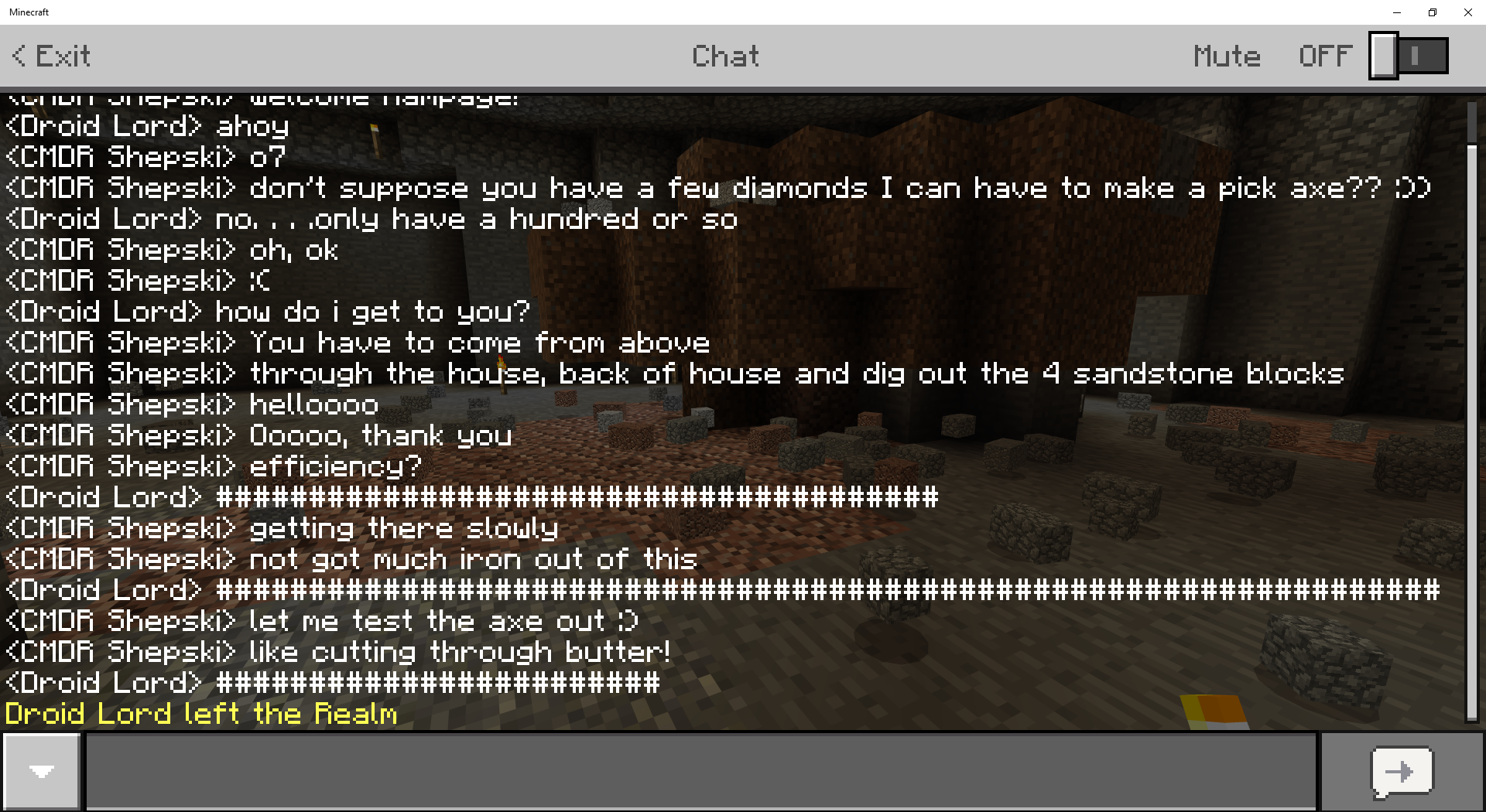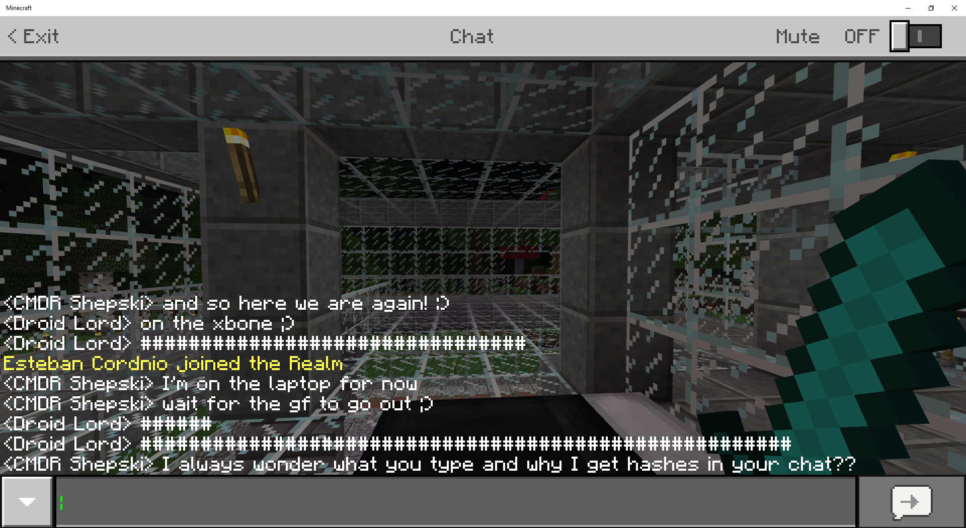 A strange chat issue has been hitting my friends and I. When I connect to a Realm from My Xbox One, chat seems to work as normal for one or two messages, after that all my chat messages are reported to be converted to '######'.