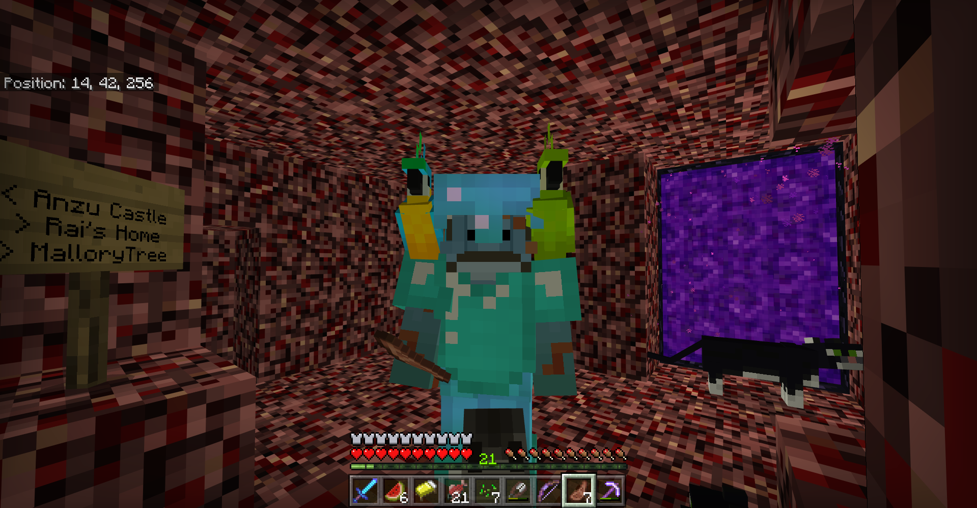 Attached is a screenshot showing myself with my parrots and a cat in the Nether.