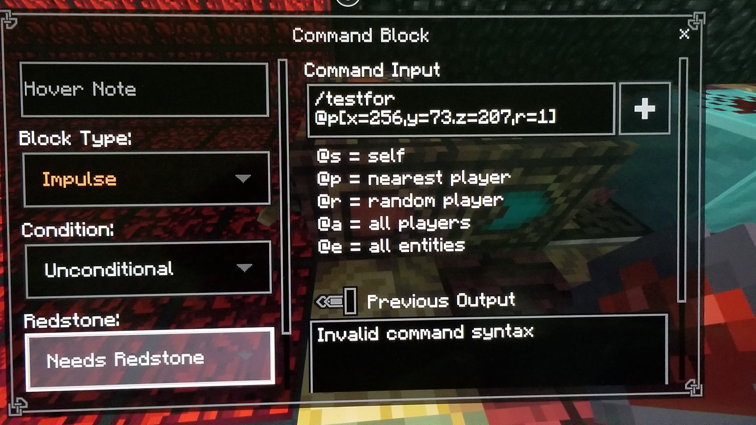 I don't know why but for some unknown reason a command or setup I've done a hundred times with command blocks without fail is now giving me an "invalid command syntax" error message when trying to do or use the "/testfor" command but there is no reason why it should be do that. All my other stuff works fine, it's just for some reason when I try to create a NEW setup I get that error message and I don't know why!