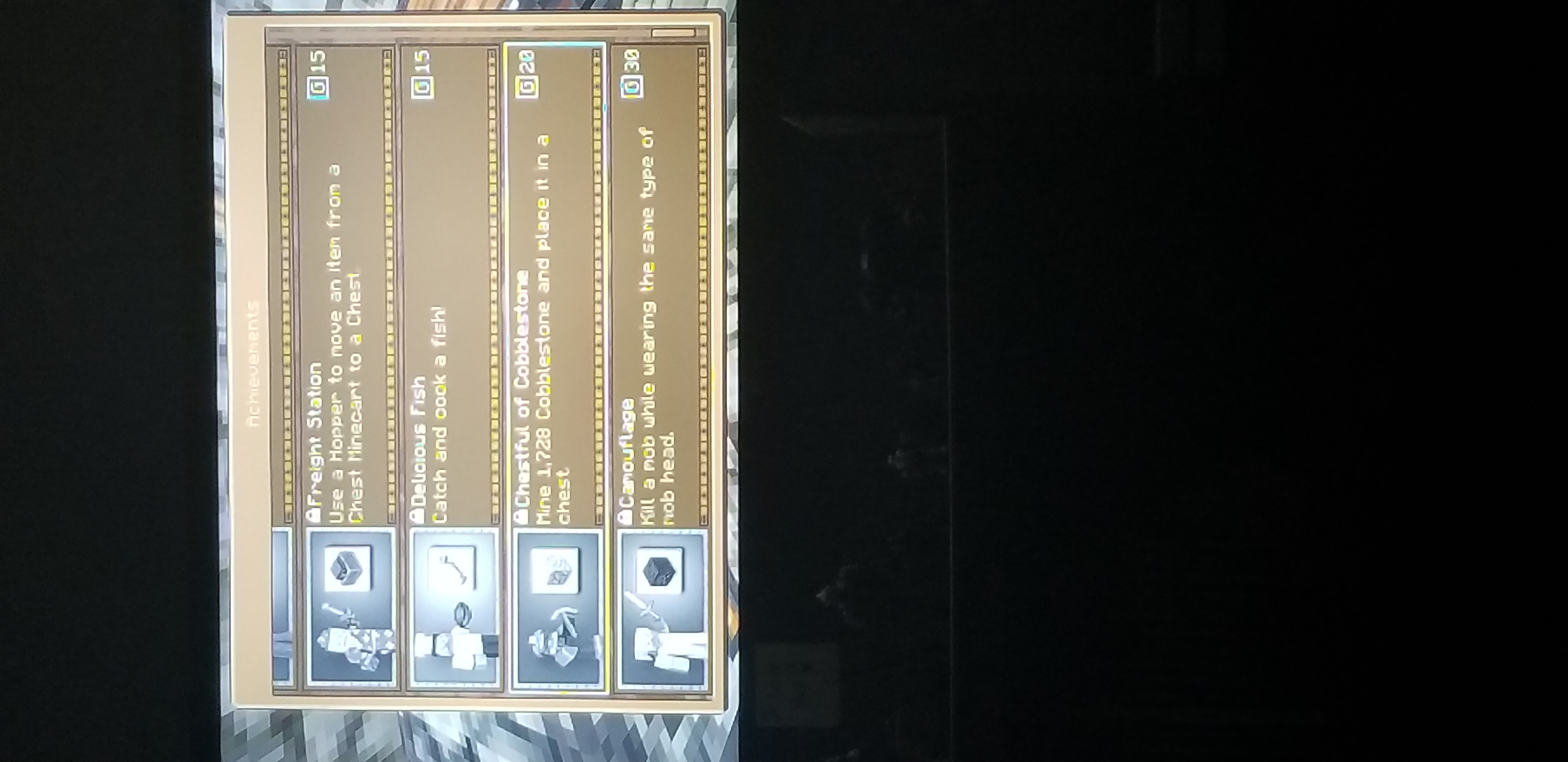 Re-tried a couple and def not working. Cobble chest attached. Tried single and double chest full. Also, did not receive Cheating Death (totem), The Lie, Repopulation, Smelt Everything, Artificial Selection, et al. Last achievement was registered 2-18-2018 and none since that date.