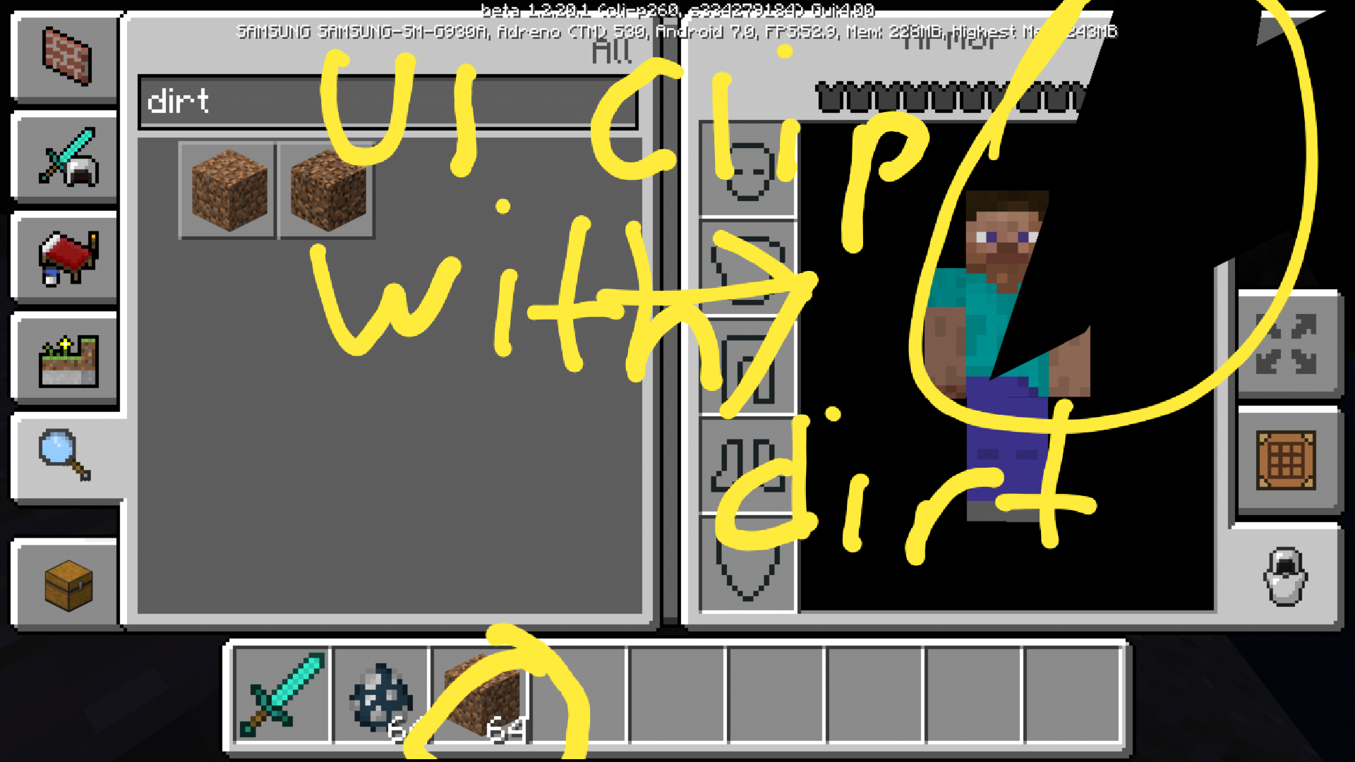 For some reason on my Samsung Galaxy S7, when I hold certain blocks such as a dirt block, it becomes heavily distorted and changes to the color black. In fact, it is so bad it even clips through the inventory when I'm using it.