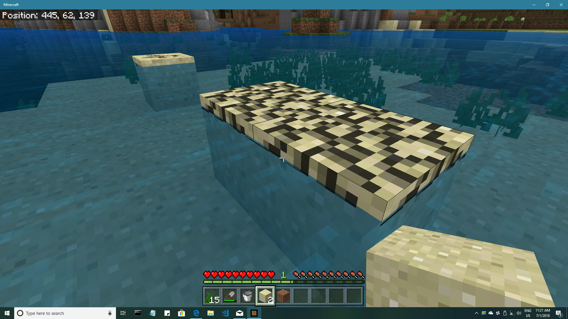 Quickly replace the dark water with a sand block. Note that the top texture has some dark spots in a block breaking pattern.