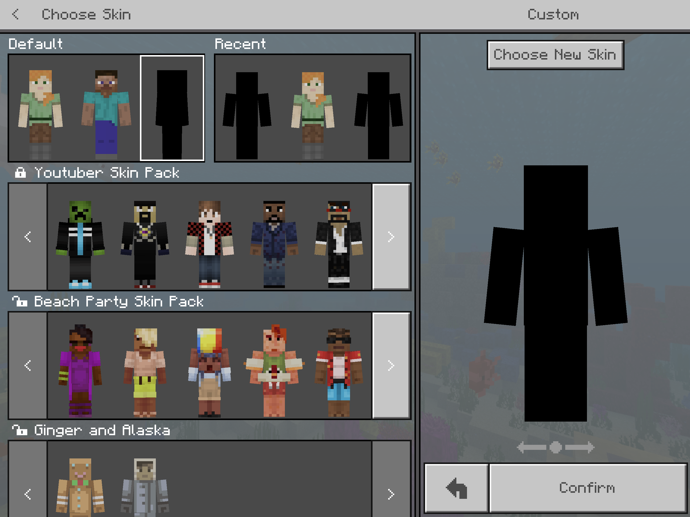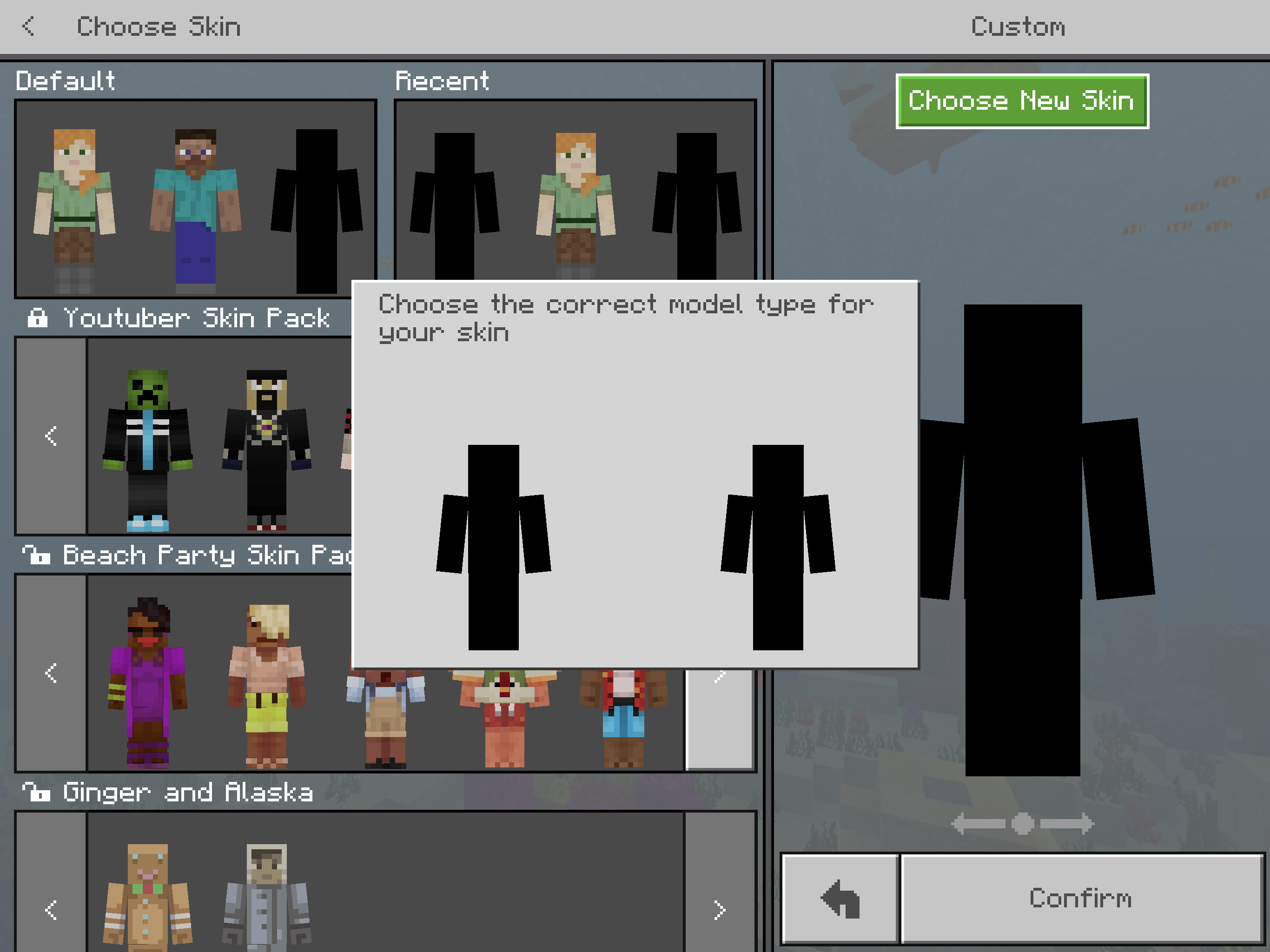 I tried to upload a skin to Minecraft PE whilst I was in a world but when it asked me to chose a skin type, the skin was completely black and both skin types had the larger "Steve" arms. I clicked on one at which point the upload skin slot had a completely black skin. I clicked confirm on the skin and exited the skin menu and continued playing the game. The paper doll displayed the previous skin I had on. When I next went on a world it said 'invalid or corrupt skin'. In the skin section in the opening screen I tried to import a different skin but it appears black like before. I tried changing it numerous times but it always appeared black and I couldn't go on a world. I can still, however select the skins from the Minecraft store and Steve + Alex without any problems but I still can't import any new skins (from the photos).