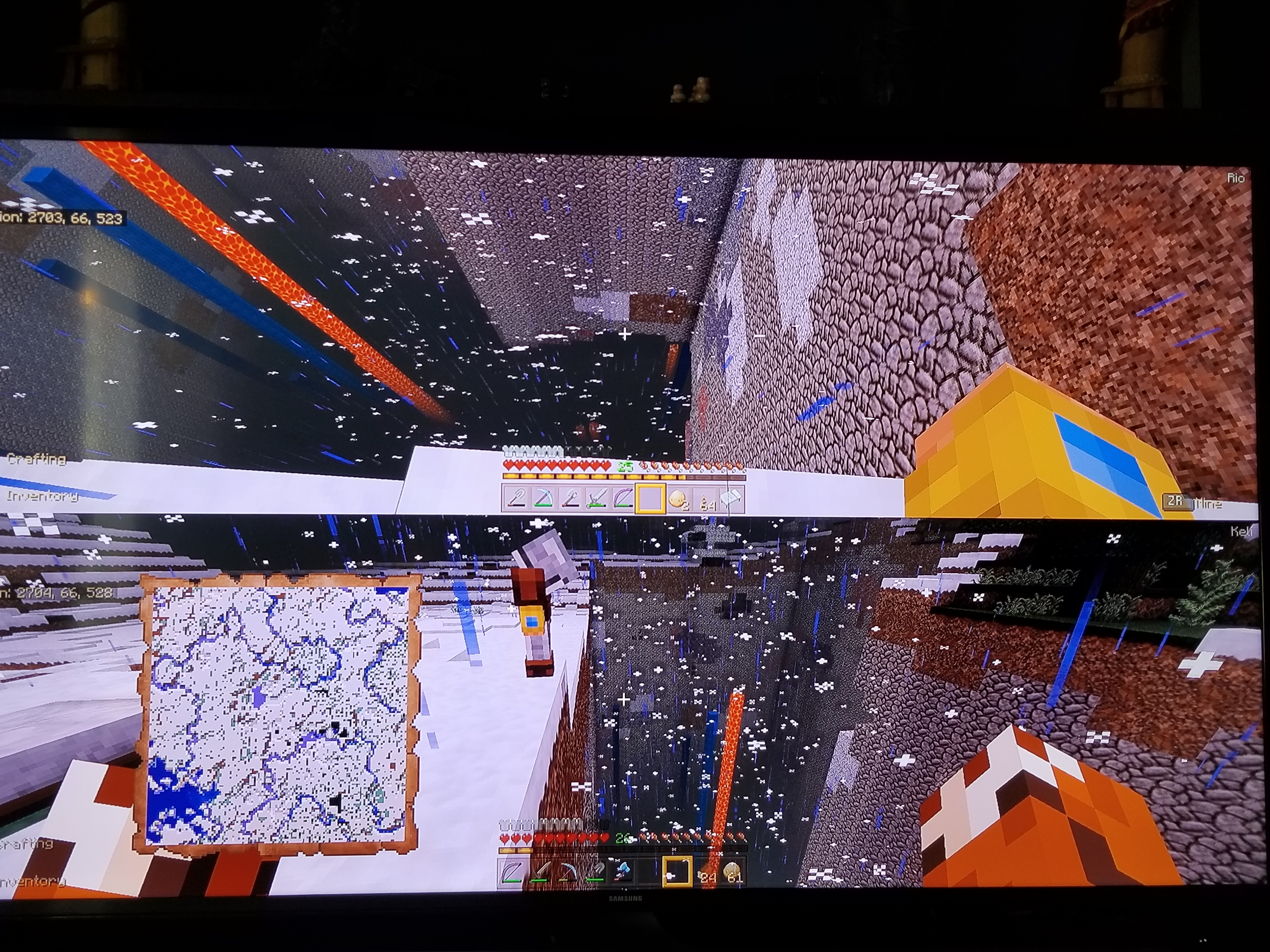 This is a Survival world (Achievements enabled) on Normal mode with two-players playing local on same console, non-realm/server. Natural texture pack, save file is about 185MB. I'm always signed into the Xbox/Microsoft/Minecraft accounts on main menu before loading the world.