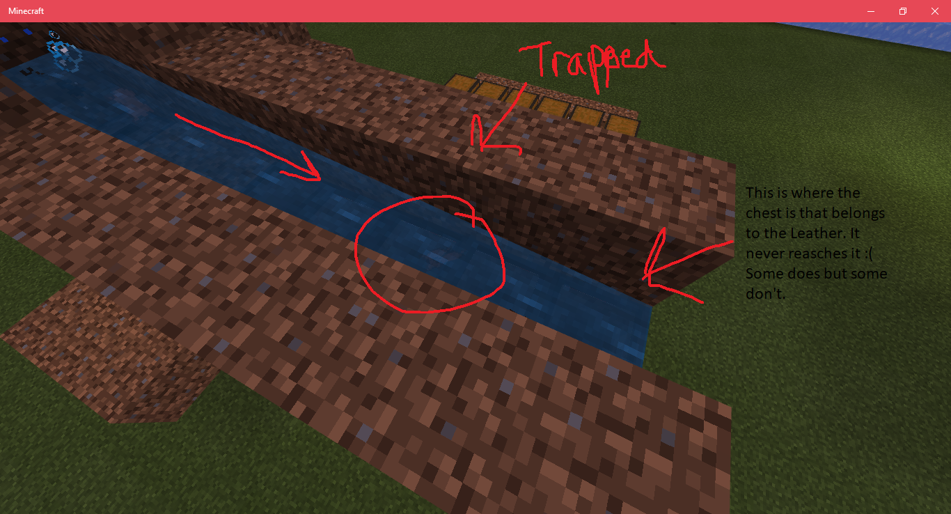 This happens more for items, like Leather, for example. In my experience anyway. The items get stuck literally on the inside edge of the hoppers. The water is unable to push it through. I added a screenshot with arrows. This happens in Java as well, on occasion. For some reason I can place comparators/repeaters on top the hoppers to make a nice even flow, it works then. Haven't seen any items get stuck, yet. <-really expensive fix though... Maybe the hit-boxes need to be adjusted? Items and hopper?