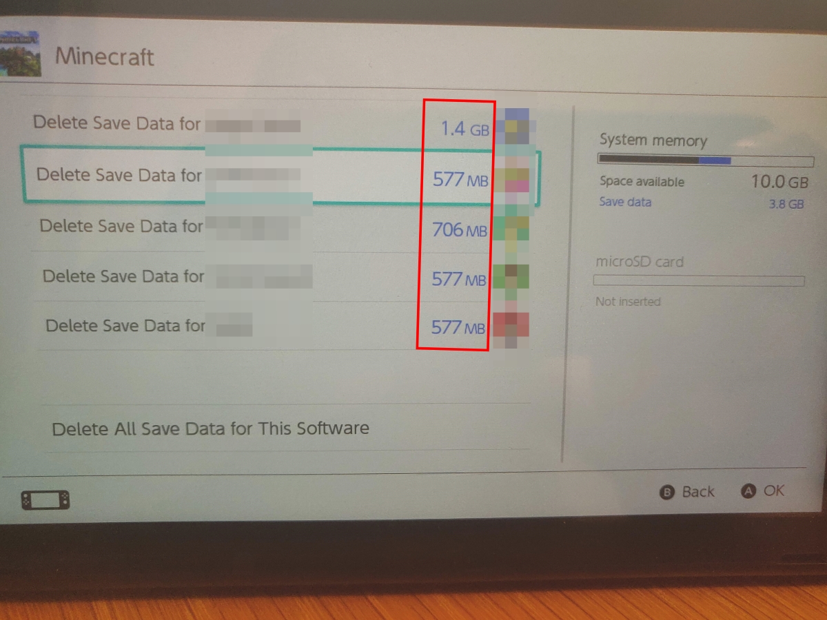 Ah, I'm sorry, I didn't quite understand what you meant at first, going into it like that it says Minecraft is taking up 1.4 GB, I'm the only one who uses the switch so that's the only number I have