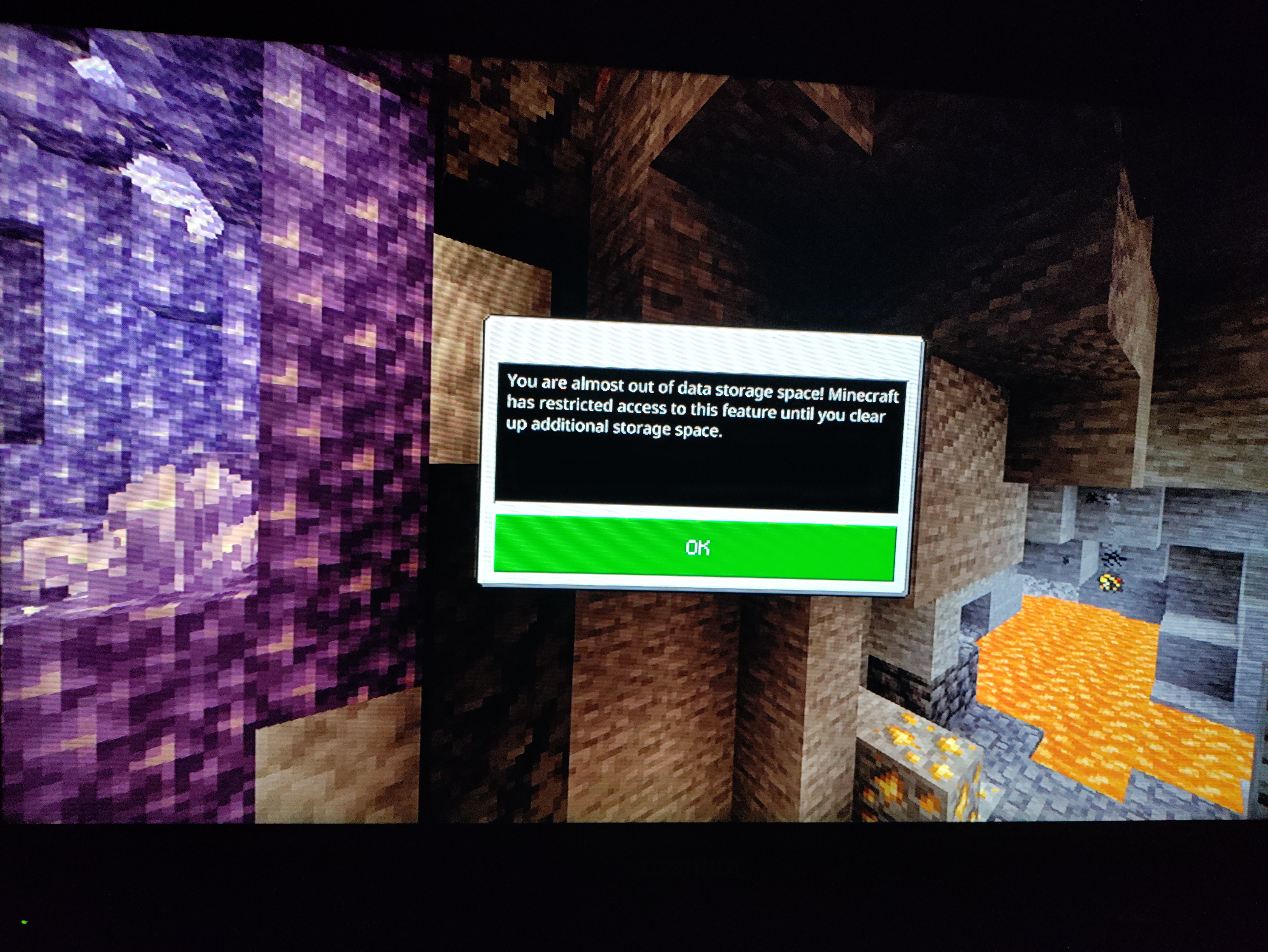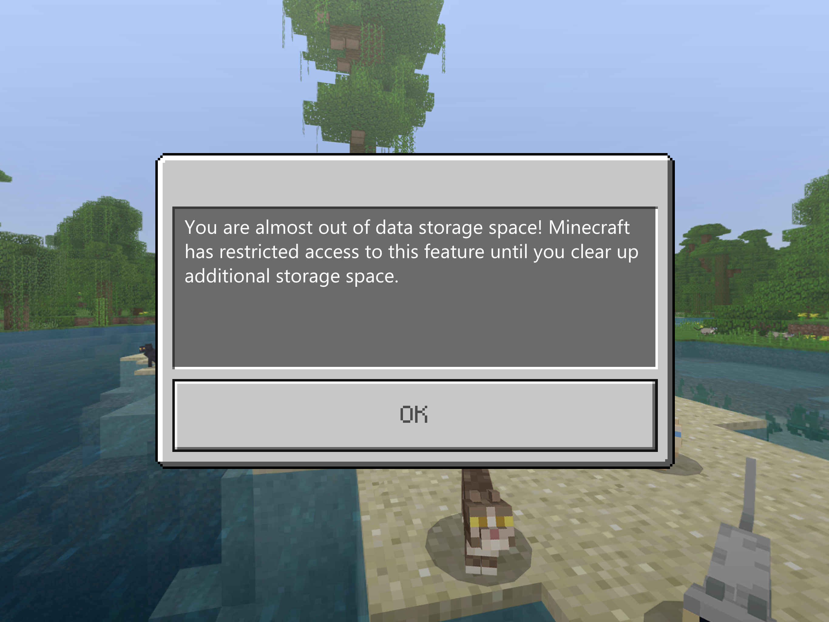 "You are almost out of data storage space! Minecraft has restricted access to this feature until you clear up additional storage space."