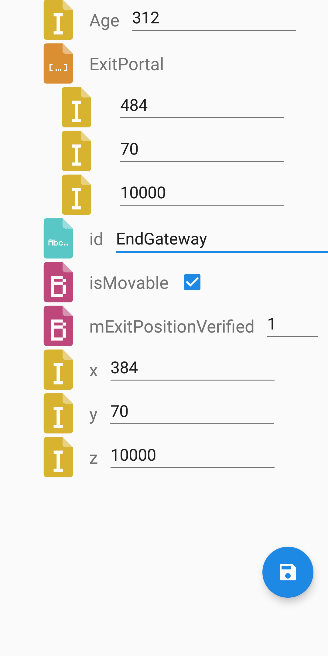 When the block is placed and checked with NBT editor, the integer field values for x, y, zย are populated with the exact location of the portal block and the exit position flag set to 1 (true). The integer field values for ExitPortal x, y, z default to 0, but if modified, these should be the target location to which the end gateway should teleport the player when entered/pearl thrown into gateway block.
