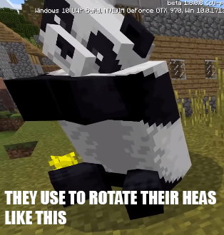 Pandas are not rotating their heads when they are sitting, eating cake or bamboo, covering their eyes during thunderstorms and laying on the ground. They only move their entire body but not rotate their heads. They use to do this in version 1.8 (Which can be seen on the Java Edition). Non of the pandas seems to rotate their heads, they rotate their full body instead.