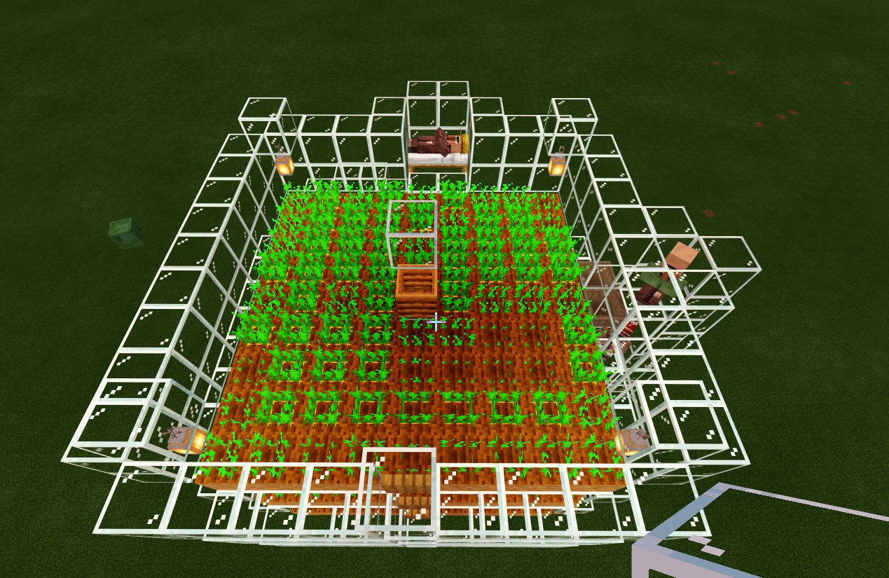 The attached image is a 3 stack 9x9 carrot farm which has never been harvested even after hours of waiting for the villagers to farm it. Each layer has a bait villager where the farm should share their carrots, however, even when given beds and extra beds the villager neither harvests nor shares.