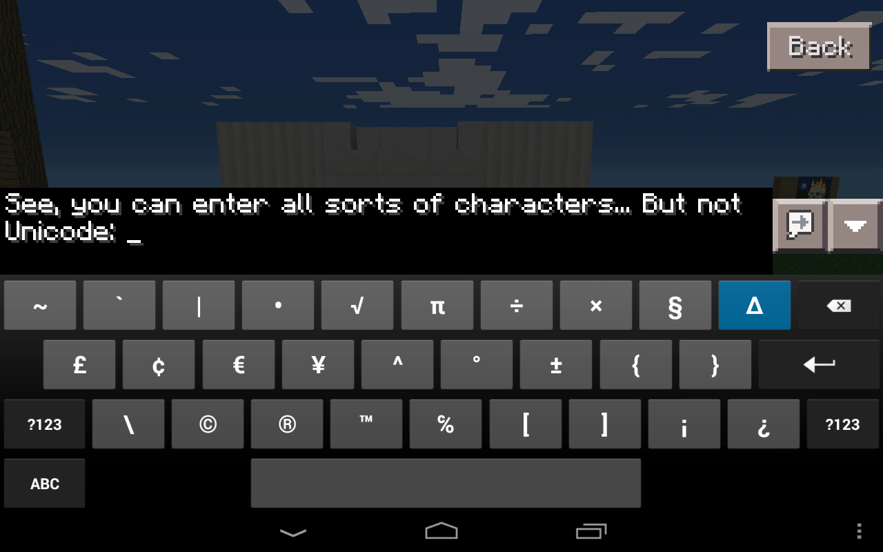 If you want to try this yourself, upgrade to Android 4.3, and try entering Unicode characters on a sign, or in any text-entering interface within Minecraft PE (besides realms login).