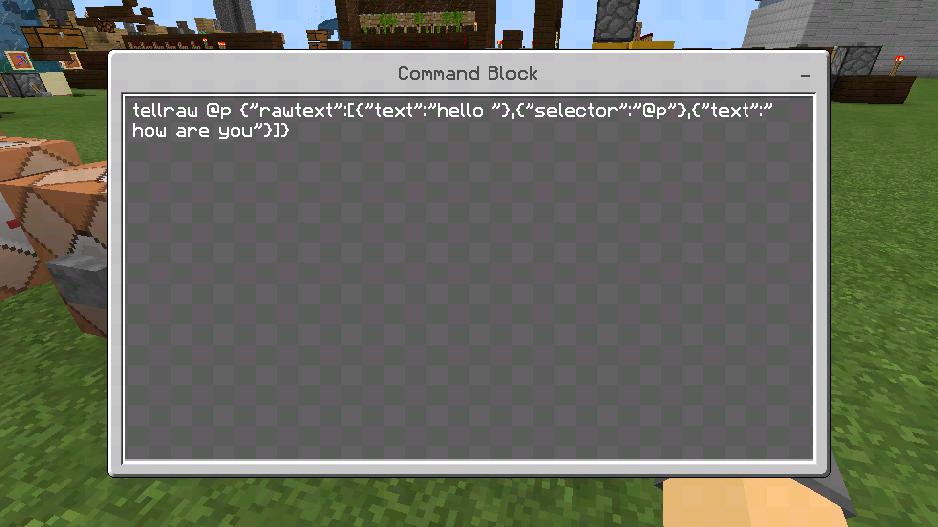 When using the /tellraw command, the "selector" argument is supposed to display the targets name. For example, @p will display the name of the closest player. However, it doesn't register the argument at all, making the command fairly limited. The first screenshot is the command line, and the second is the displayed output