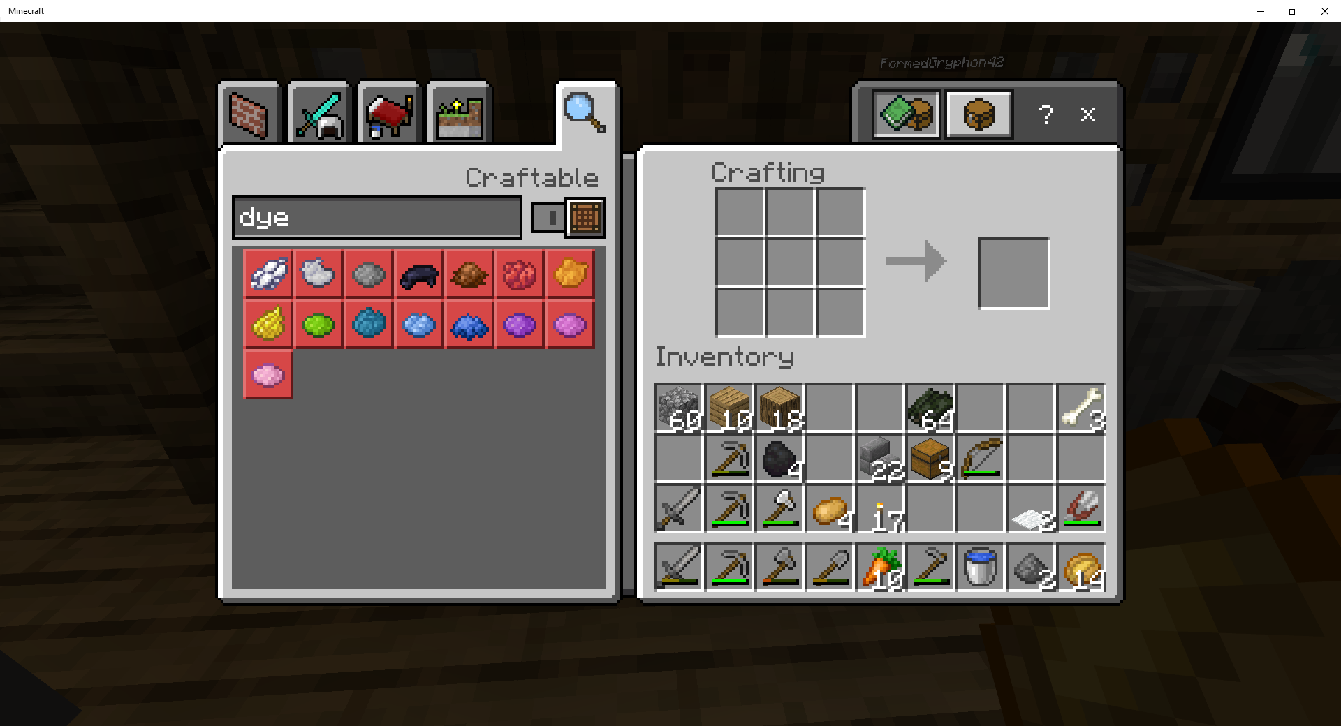 This is Minecraft Bedrock. I am in the crafting table 3x3, and only 15 dyes show up, instead of 16 like usual.