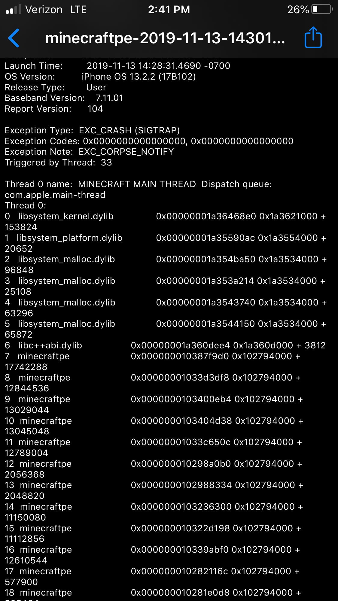 I recently updated to iOS 13.2.2 since my phone was kinda out of date, I updated Minecraft to 1.13.1 and it still crashes during gameplay. I am not sure what exactly causes it..