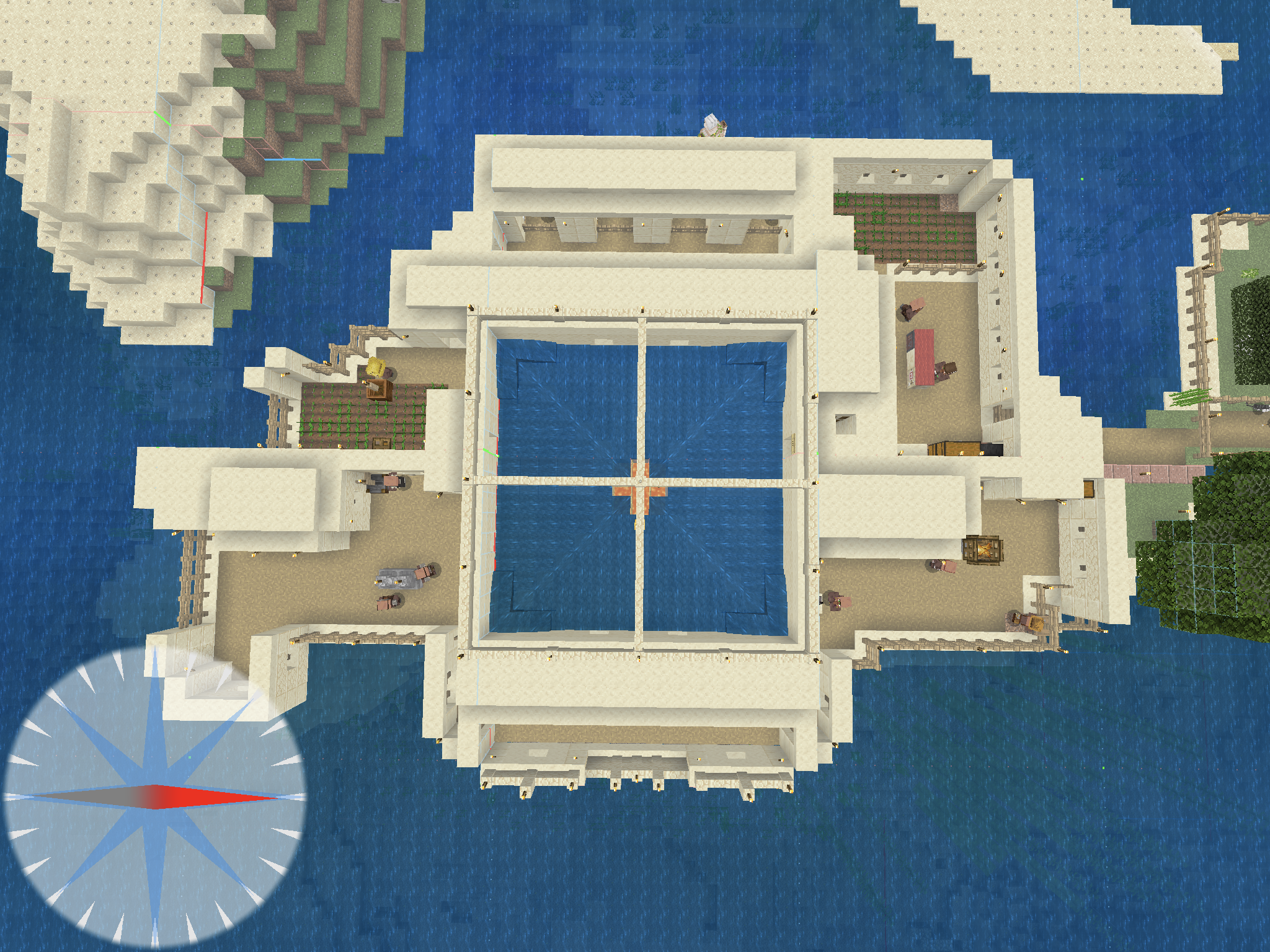 I've attached a screenshot of the village. All beds and workstations are placed on slabs. All roofs are slabs. All fences are placed on slabs. Carpet, walls, fences, or lanterns are placed over every workstation. Any other block is dirt path. The bell is located 2 blocks to the water side (east) of the center of the water trap. Most of the villagers are librarians. The island to the west of the village is needed to allow raids to have a spawn point outside the village.