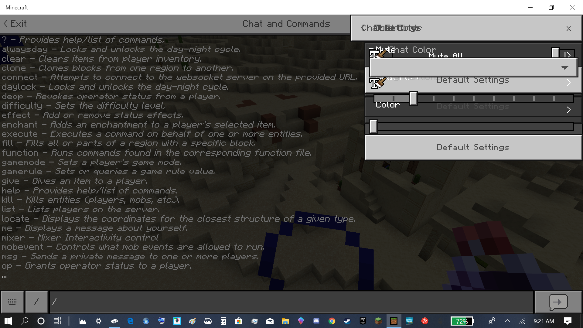 When I Open chat, the font customization, and color customization are already open ontop of each other. This means that I can't use chat, close chat or close the customization. This makes me have to just close Minecraft with the X in the top right corner.