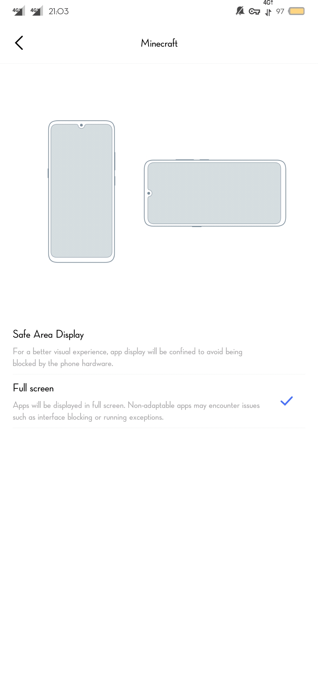 Hello, I'm a player from China's Minecraft International Edition Bedrock Edition. I want to fit the full screen of my device's water drop on the Bedrock Edition. Because there is no adaptation, there is a large black border on the left camera part of my device, which is particularly uncomfortable to play. I tried changing the aspect ratio of the third-party application in the settings, but it didn't work. I tried the latest stable version 1.13.x to the beta version 1.14, but none of them solved the problem.