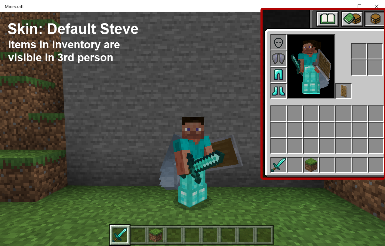 See screenshots (taken in Windows 10, v1.14.1), I added the default Steve for comparison. The screenshots were taken in singleplayer. However, other people on Multiplayer also can not see the items in my characters hands. The items are visible for me in first person.