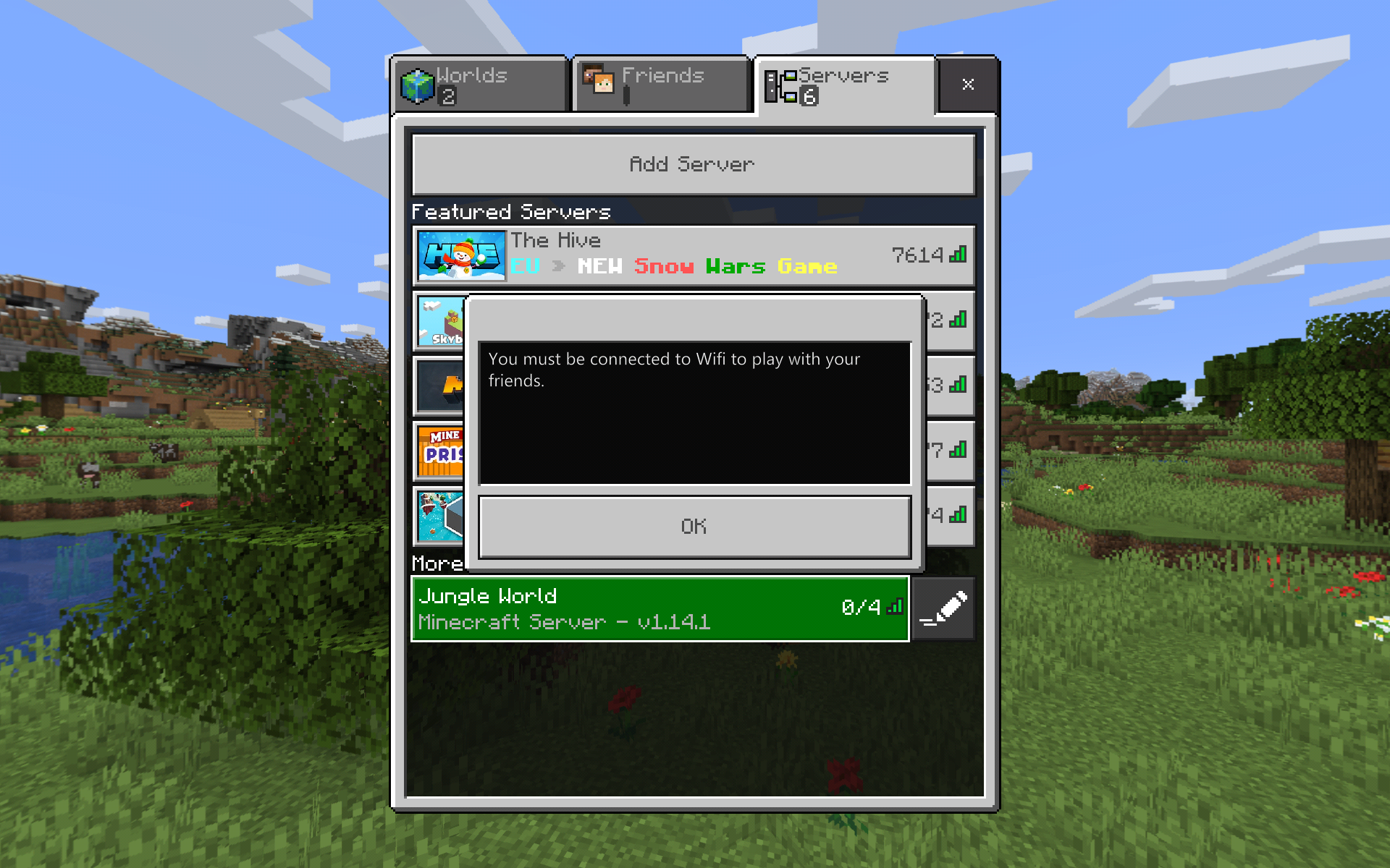 Despite the presence of an internet connection on the device via an ethernet dongle or tethering with a computer, the game refuses to let you connect to Realms, BDS, or public servers, LAN games.