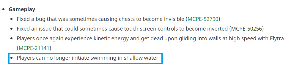 Hello. The swimming features in at least my version has been changed/altered. I now cannot go into swimming mode unless my character can go under water fully. This has ruined soo many secret rooms and has just made water building less fun. Love the swimming on stomach. Hate not doing so unless under water. Please fix this as soon as possible 🙏
