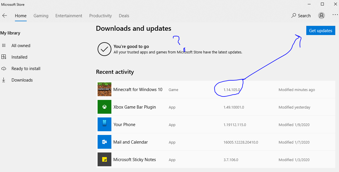 In the Microsoft Store, Minecraft for Windows 10 version 1.14.105.0 does not update to version 1.15 when we hit 'Get Updates'. I'm trying to help my kids so not sure if this is right section for issue (Affected version is a guess). Any help would be appreciated to spell it out for my like 'Minecraft for Dummies'.