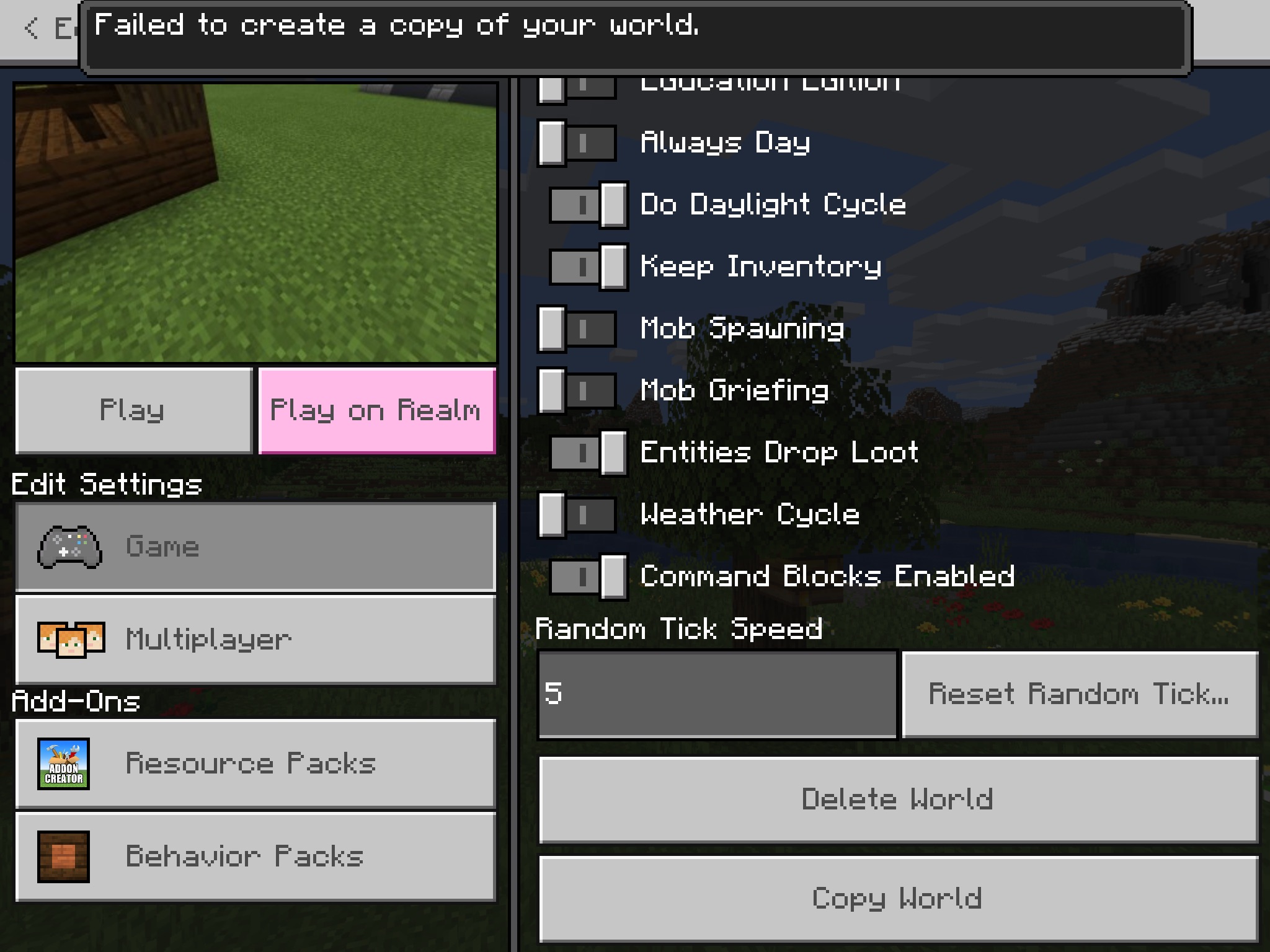 I’m using Minecraft bedrock edition, my world is on experimental mode. After I added a certain shader everyone had called “realistic shaders” I couldn’t copy the world, I tried other versions of this world before I added the shaders and it copied very easily. After I searched for the problem I found out other people has resources packs or behavior packs on this world. I want this bug to be solved soon as possible( if you can ) because I got a friend waiting for it please!