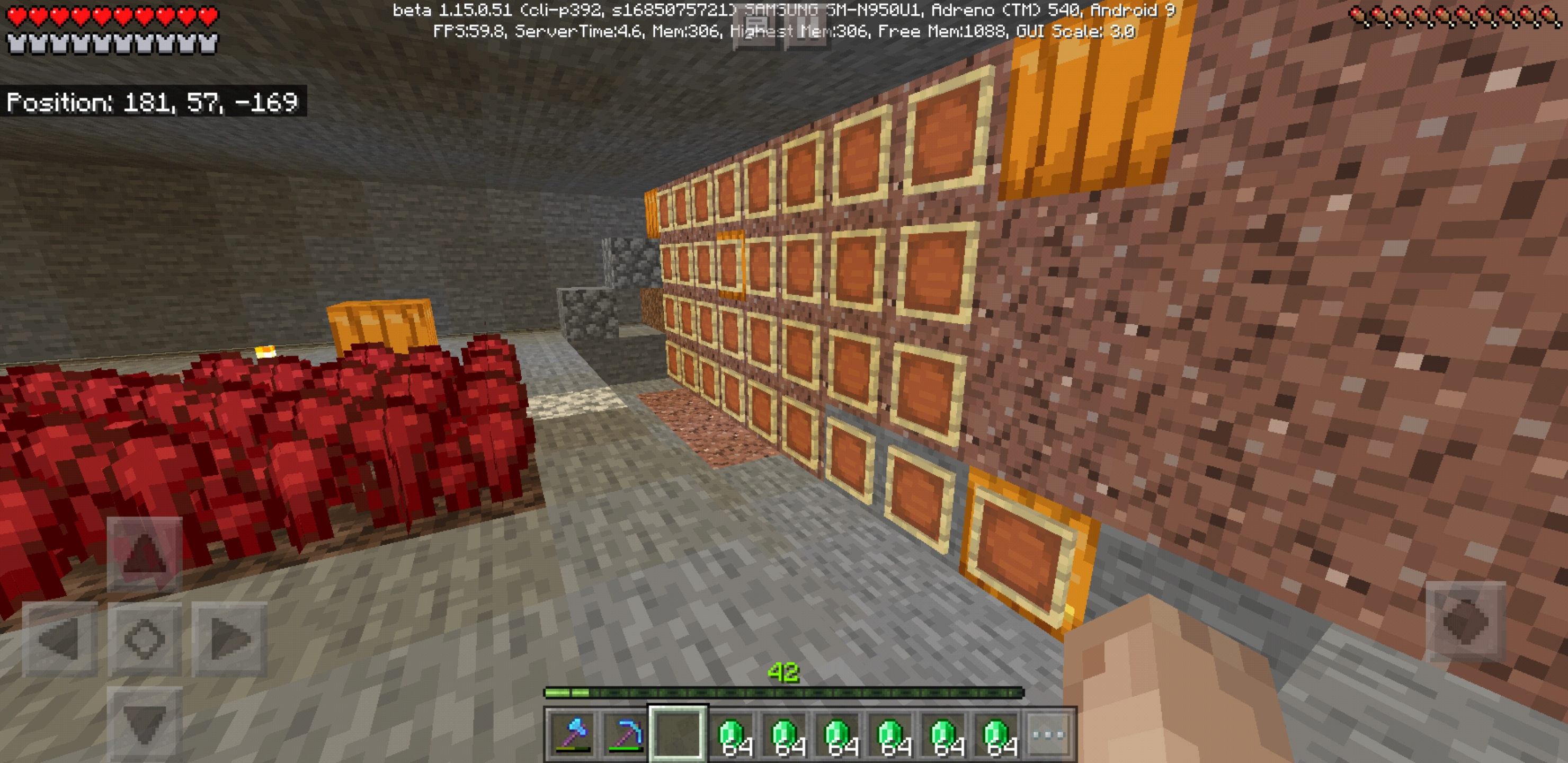 I had the texture pack Clear Craft enabled when I loaded my world into 1.15.0.51 and was met with unbearable lag. I determined that the cause was not from my map wall or too many animals. The map wall screen shot is in my base after I significantly reduced my live stock numbers, down to 2 of each. I went to a village that has spawned 30-50 villagers, second screen shot, and the game operated basically normal with Clear Craft active. It seems to work long as I was far enough away from my base for it to not render, 6 chunks is my render distance. With no texture packs enabled it is running great, 50-60 fps, third screen shot. I think it could be a combination of my automated smelter and my some 20-30 chests, most are over half full.