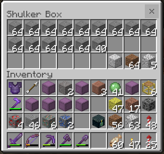 This image shows I had space to take the 5 in the shulker, but they would not move, and the 63 remained also.
