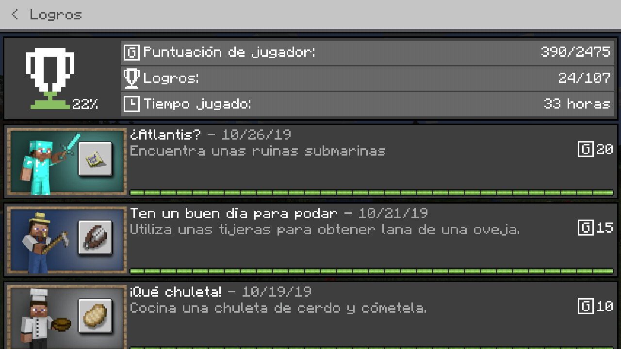 Tengo un problema con los logros, no funcionan, aparece como si no hubiese hecho ninguno. La imagen 1 (en marrón), lo muestra, aparece que tengo 0 logros, cuando eso no es cierto. En Android si tengo logros, y uso la misma cuenta; en android no me quita los logros de un mundo normal cuando juego en creativo en otro mundo; esto sucedió cuando jugué en creativo en Windows 10, me desactivó los logros para todo el juego, cuando el juego dice que los desactiva por mundo, no el juego entero. La segunda imagen (en gris) pertenece al minecraft de android, ultima version. Quedo atento a sus respuestas, gracias!
