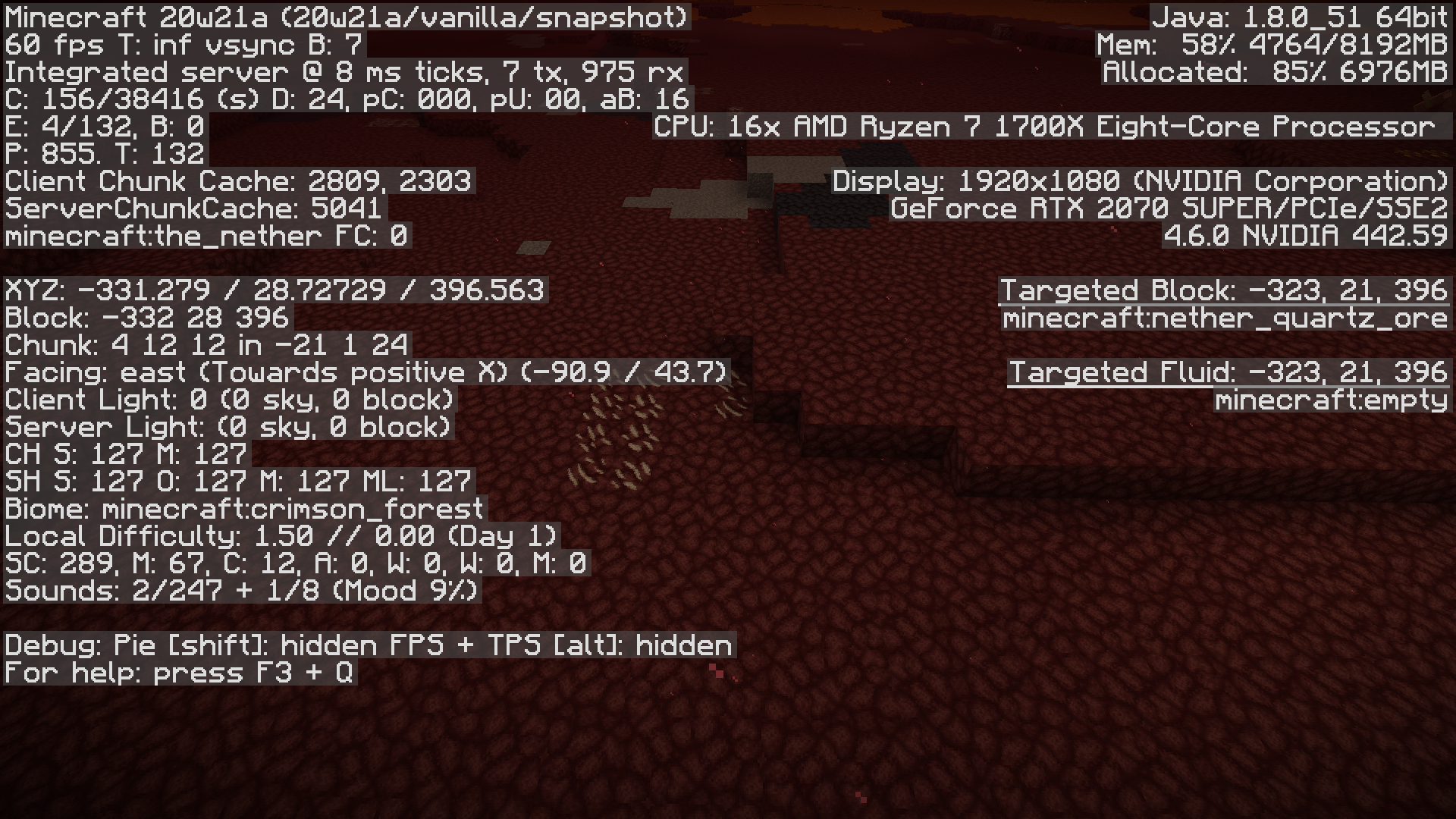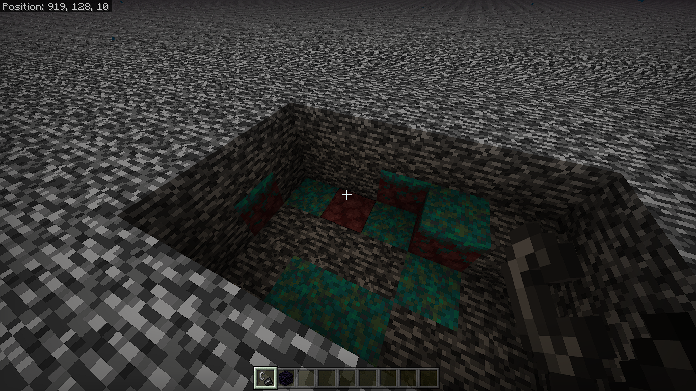 On crimson and warped forsets: Nylium and wart blocks generate below the lava on lava lakes and below the bedrock on the ceiling from around Y=32 to Y=28 the terrain seems normal with only netherrack and magma. after Y=28 nylium (and rarely wart blocks) generate like in normal terrain.