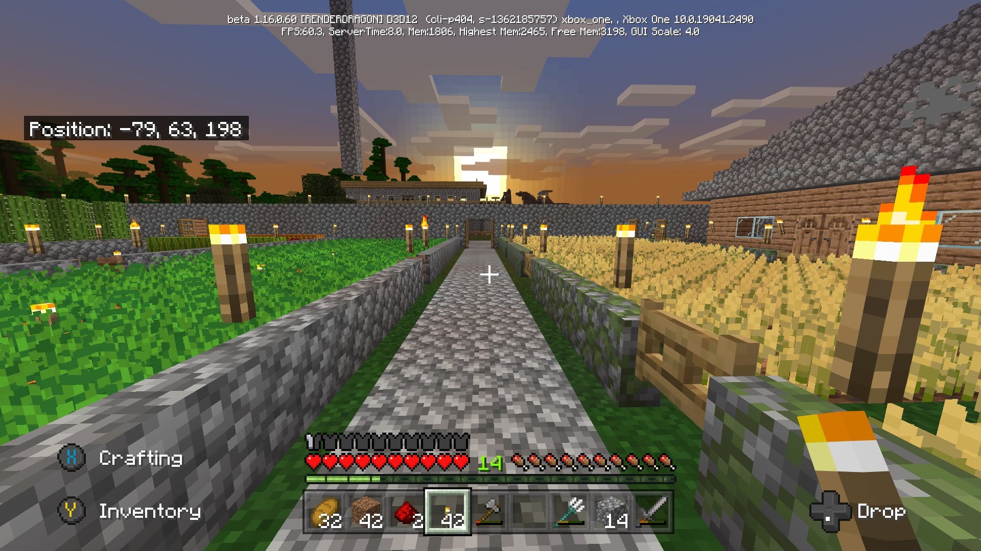 Torches placed on cobblestone walls that are not corner pieces will result in the wall not creating a pillar that the torch can sit on. The torches will simply float in the air.